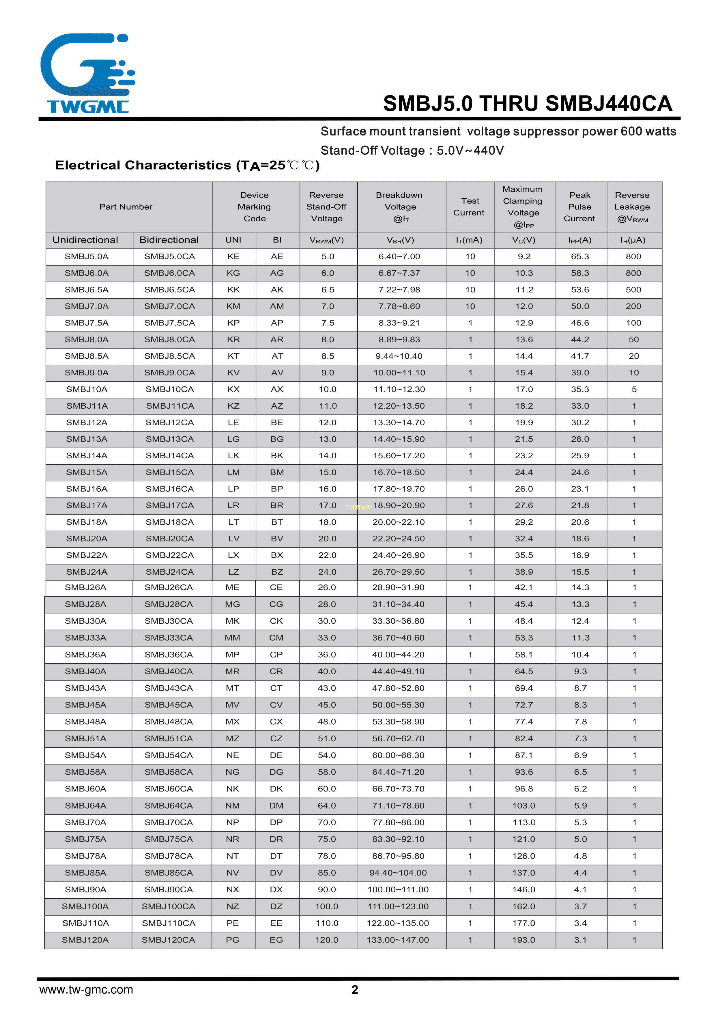 SMBJ40A数据手册SMB封装TWGMC(台湾迪嘉)PDF规格书,中英文下载