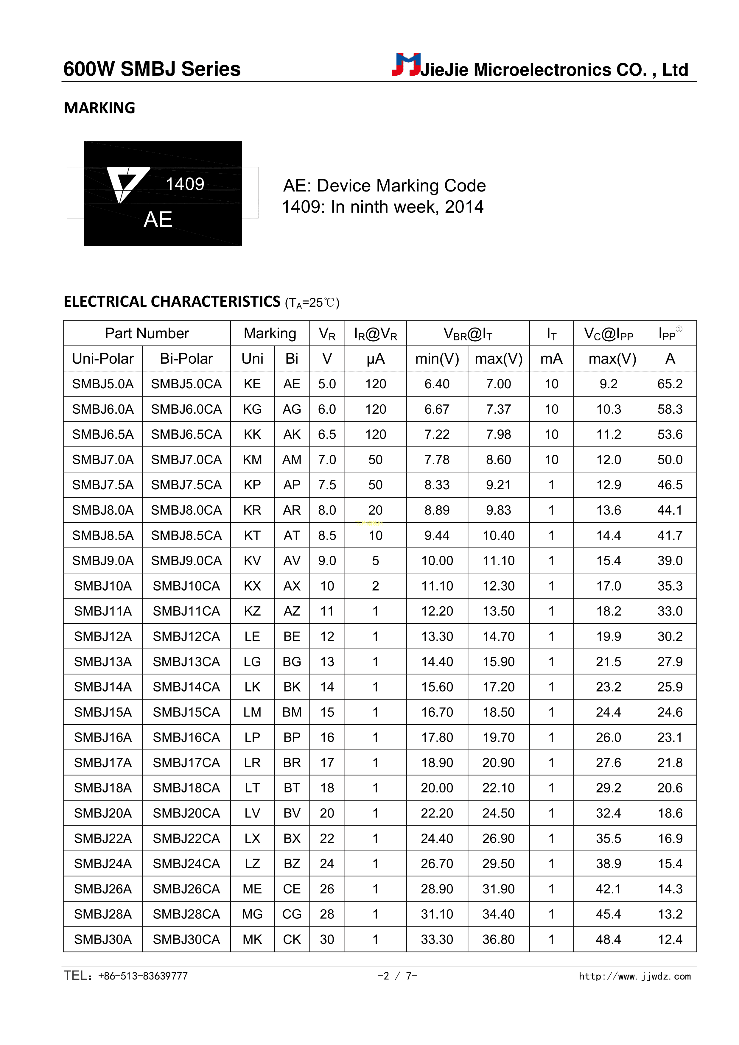 SMBJ43CA数据手册SMB(DO-214AA)封装JJW(捷捷微)PDF规格书,中英文下载