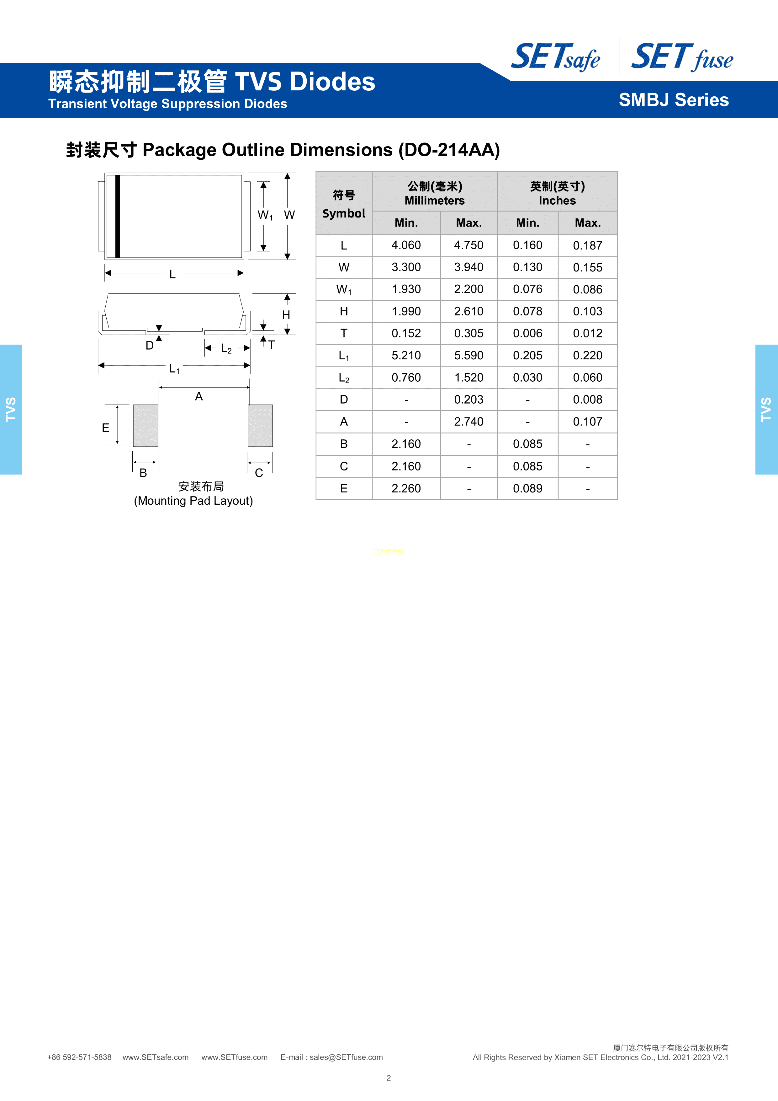 SMBJ58A数据手册SMB封装SET(赛尔特)PDF规格书,中英文下载