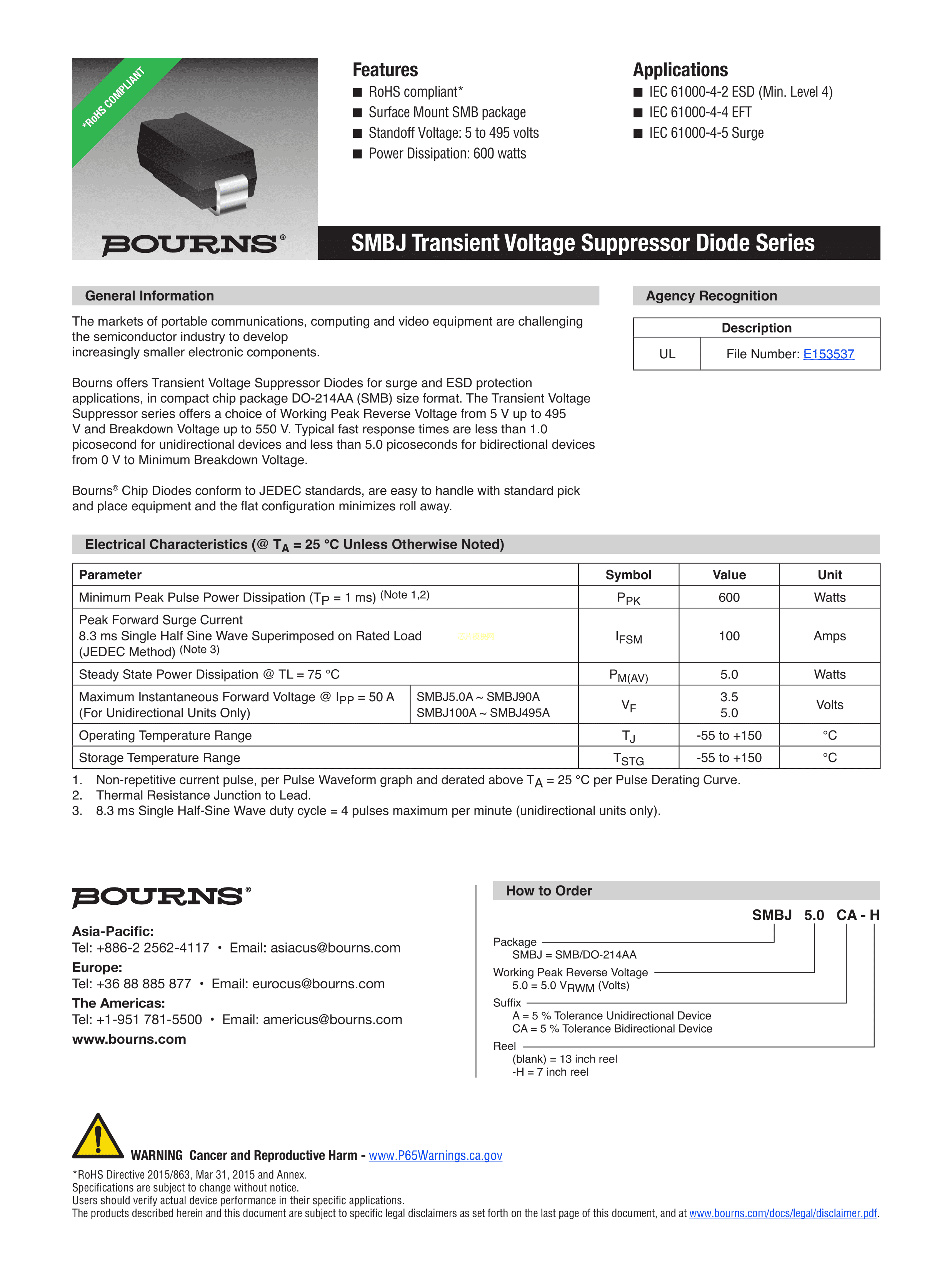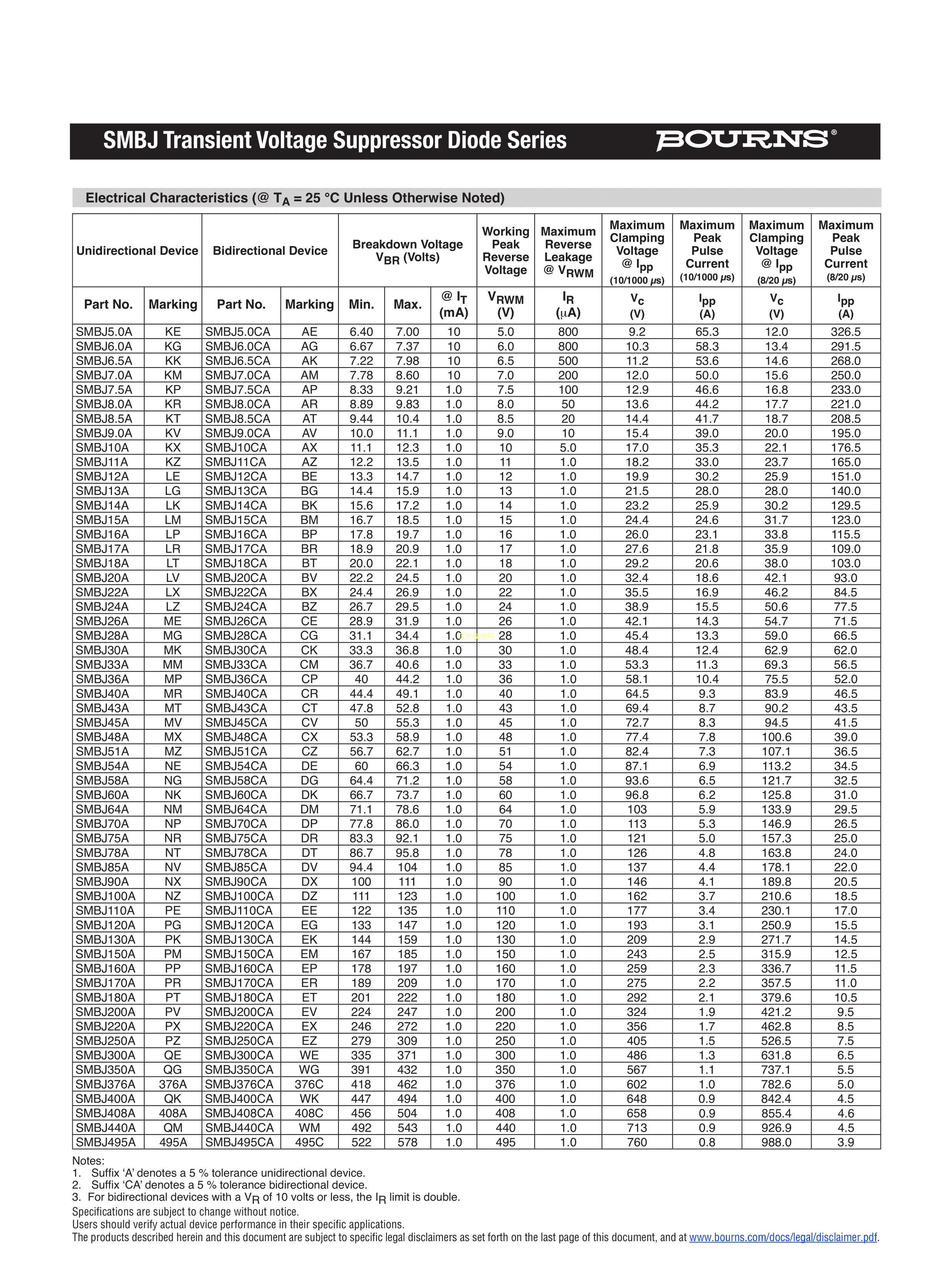 SMBJ6.0A数据手册SMB(DO-214AA)封装BOURNSPDF规格书,中英文下载