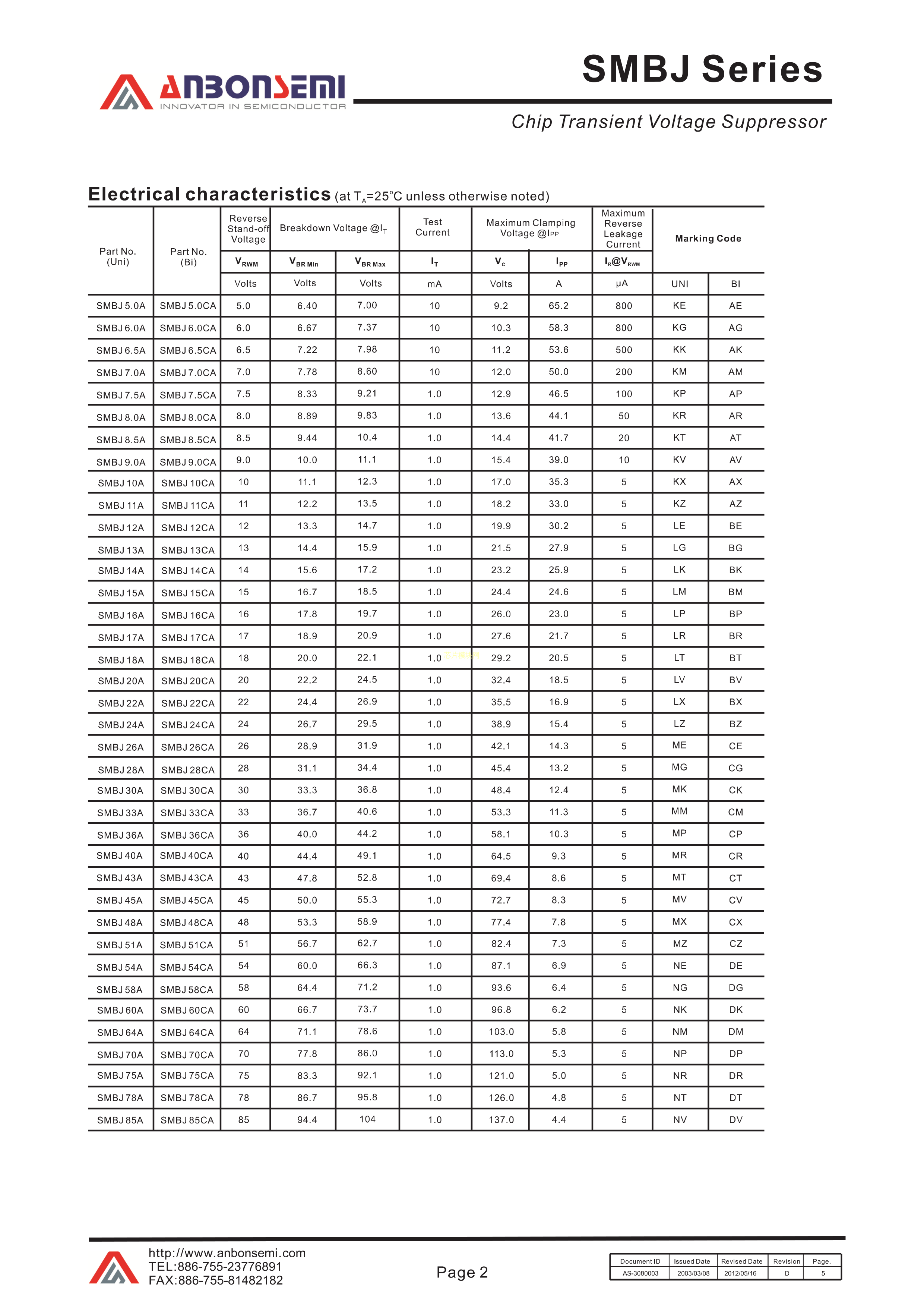 SMBJ6.5A数据手册SMB封装AnBon(台湾安邦)PDF规格书,中英文下载