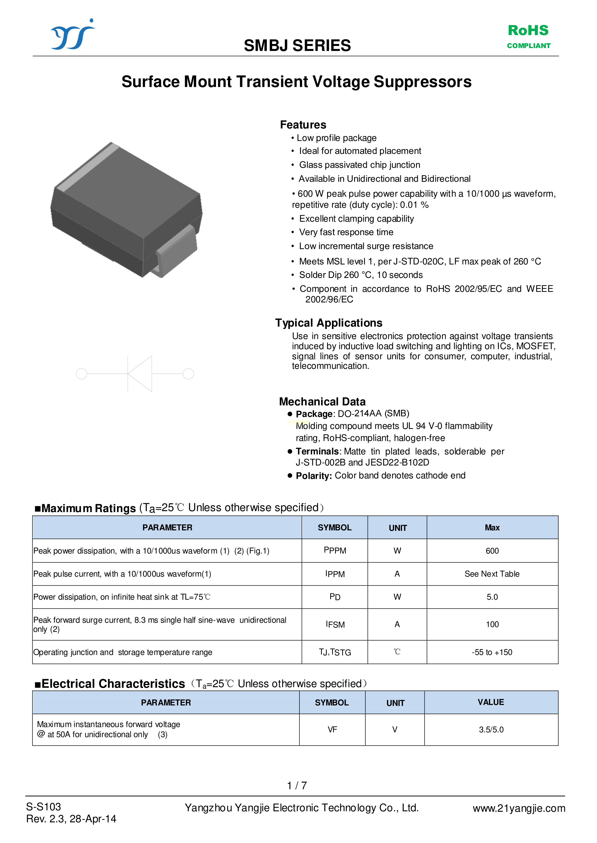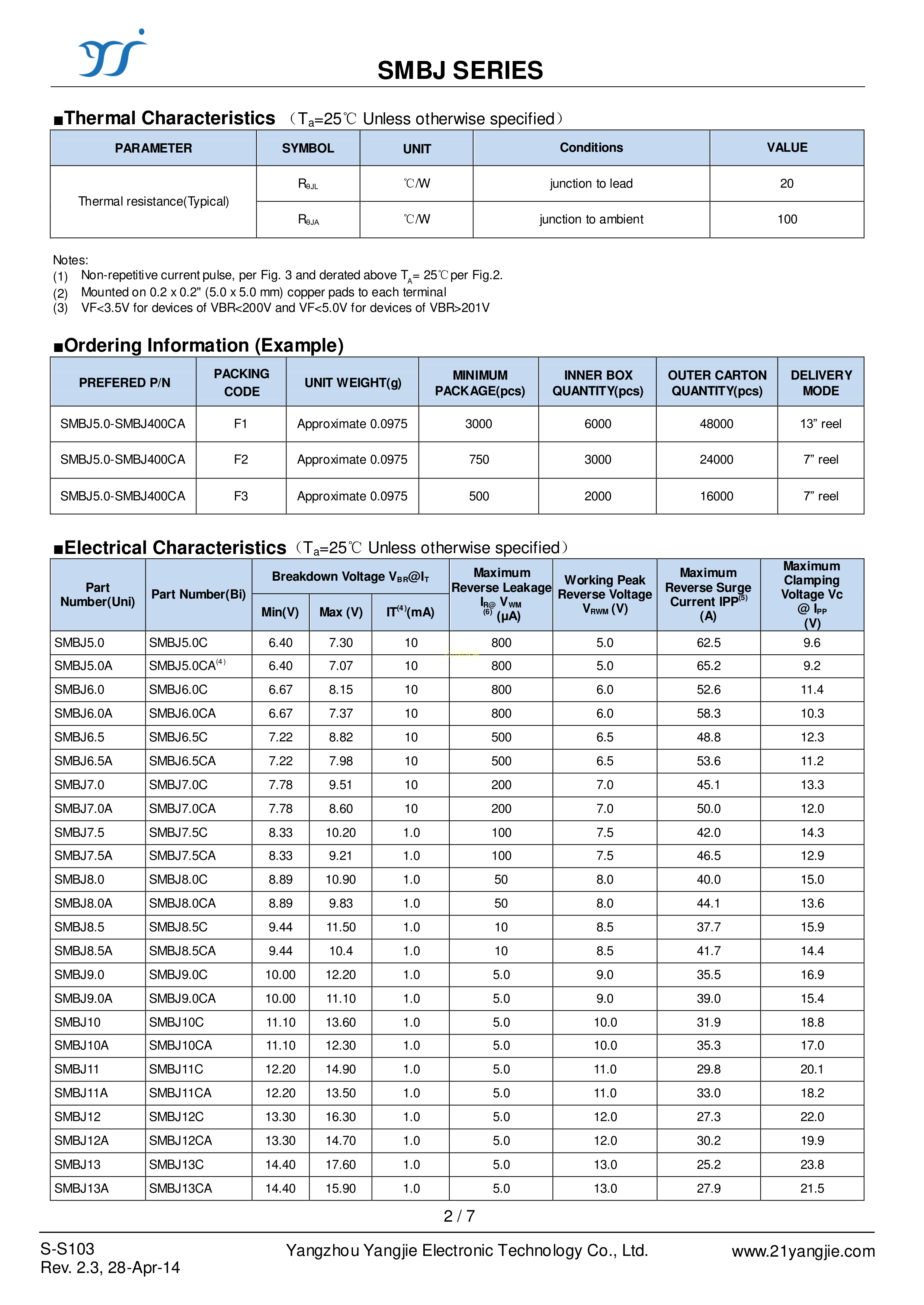 SMBJ6.5A数据手册SMB封装YANGJIE(扬杰)PDF规格书,中英文下载