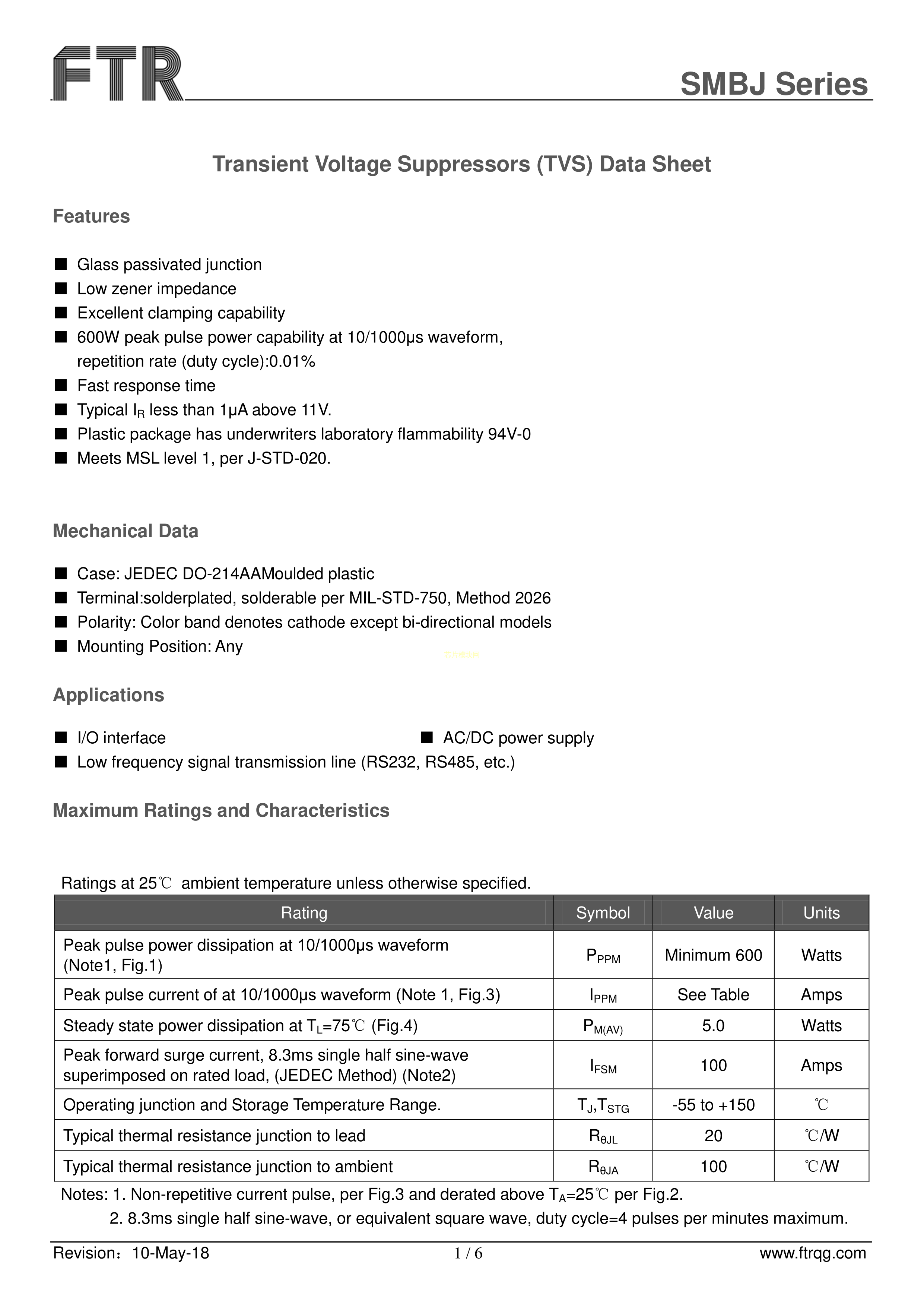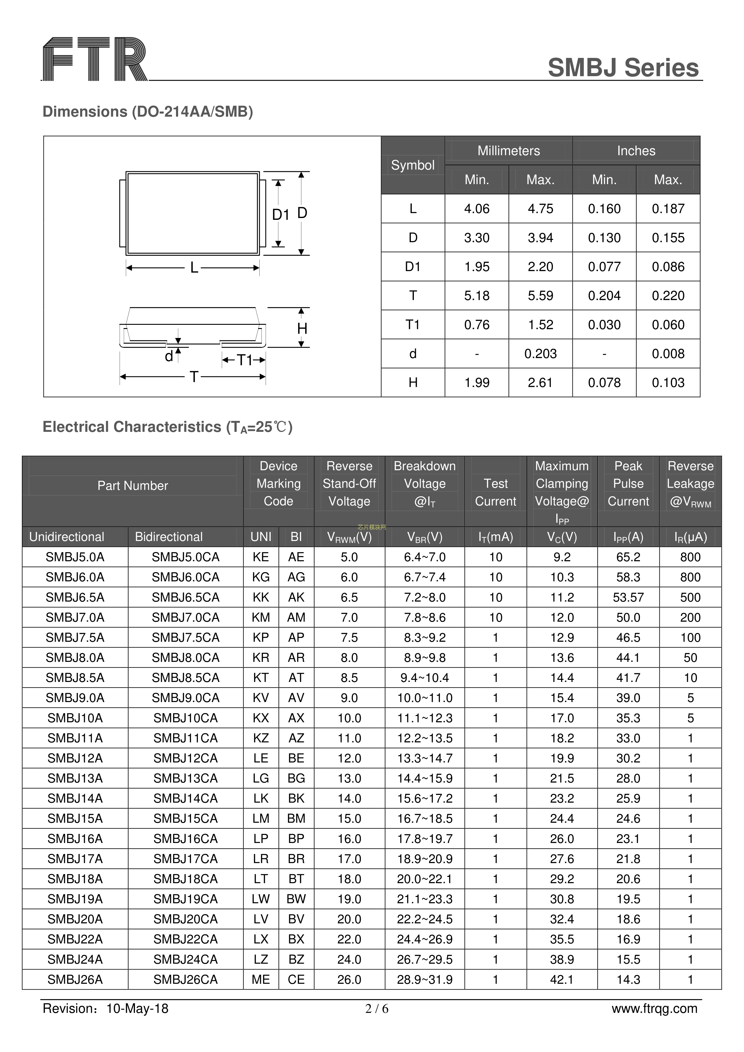 SMBJ6.5CA数据手册SMB(DO-214AA)封装FTR(乔光电子)PDF规格书,中英文下载
