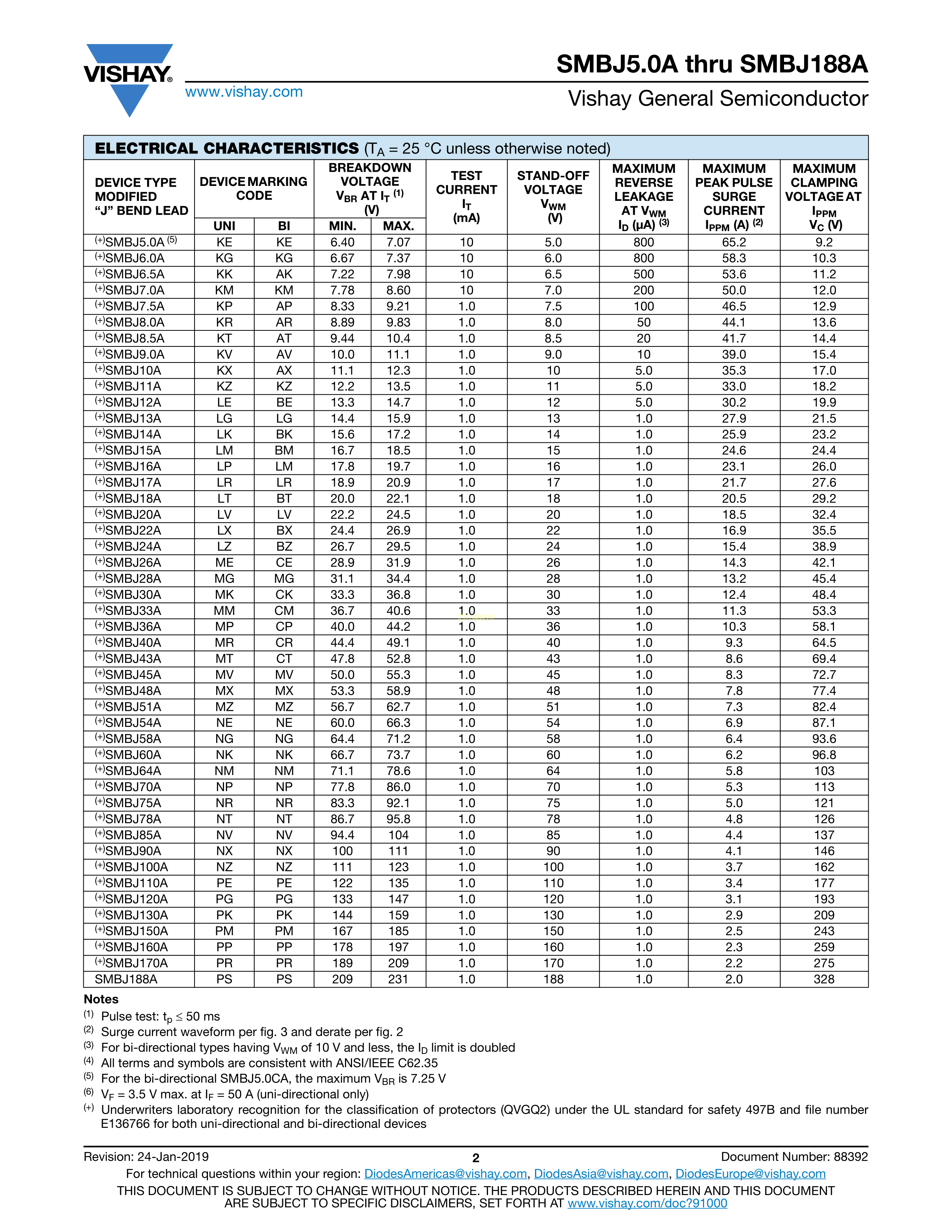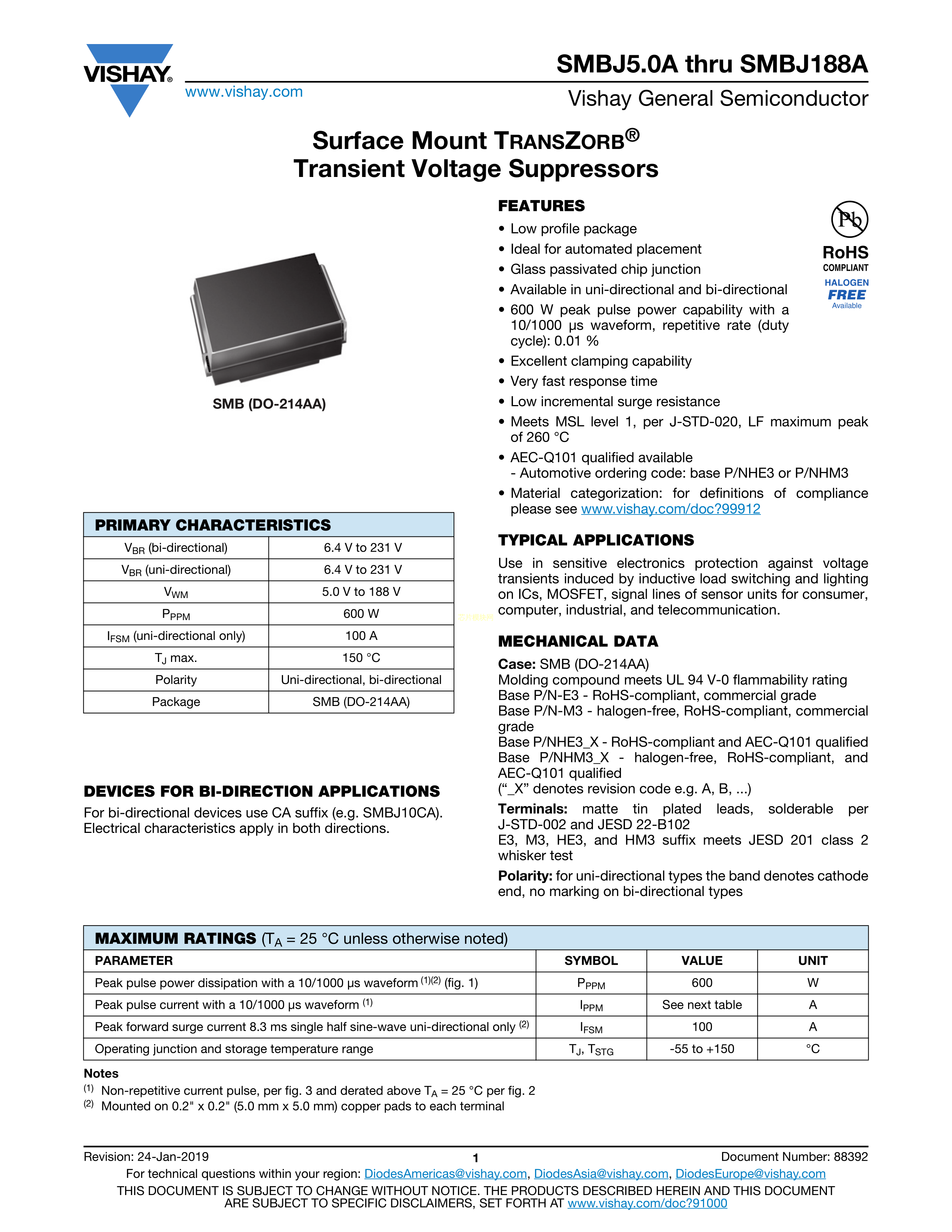 SMBJ6.5CA-E3-52数据手册DO-214AA封装VISHAY(威世)PDF规格书,中英文下