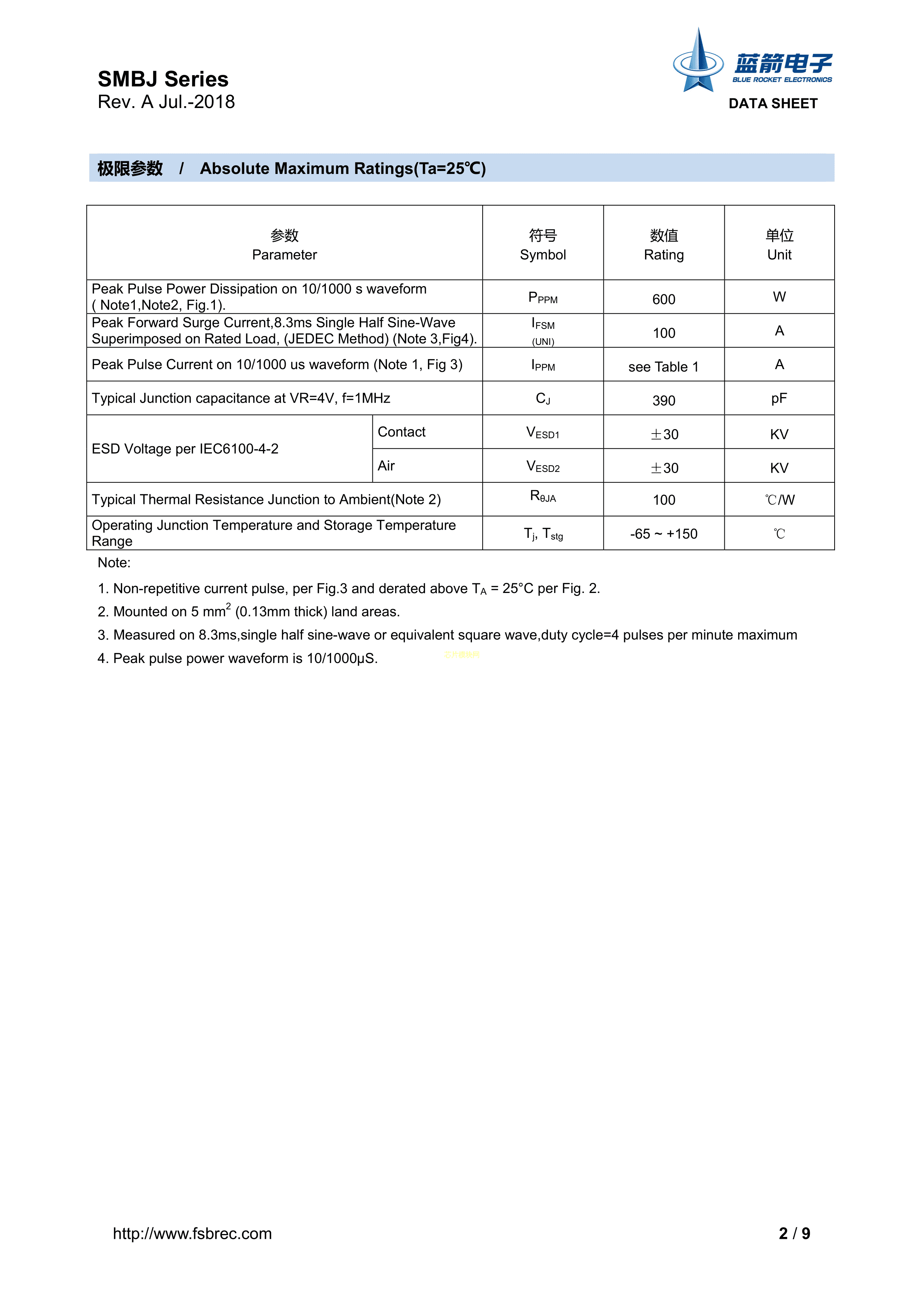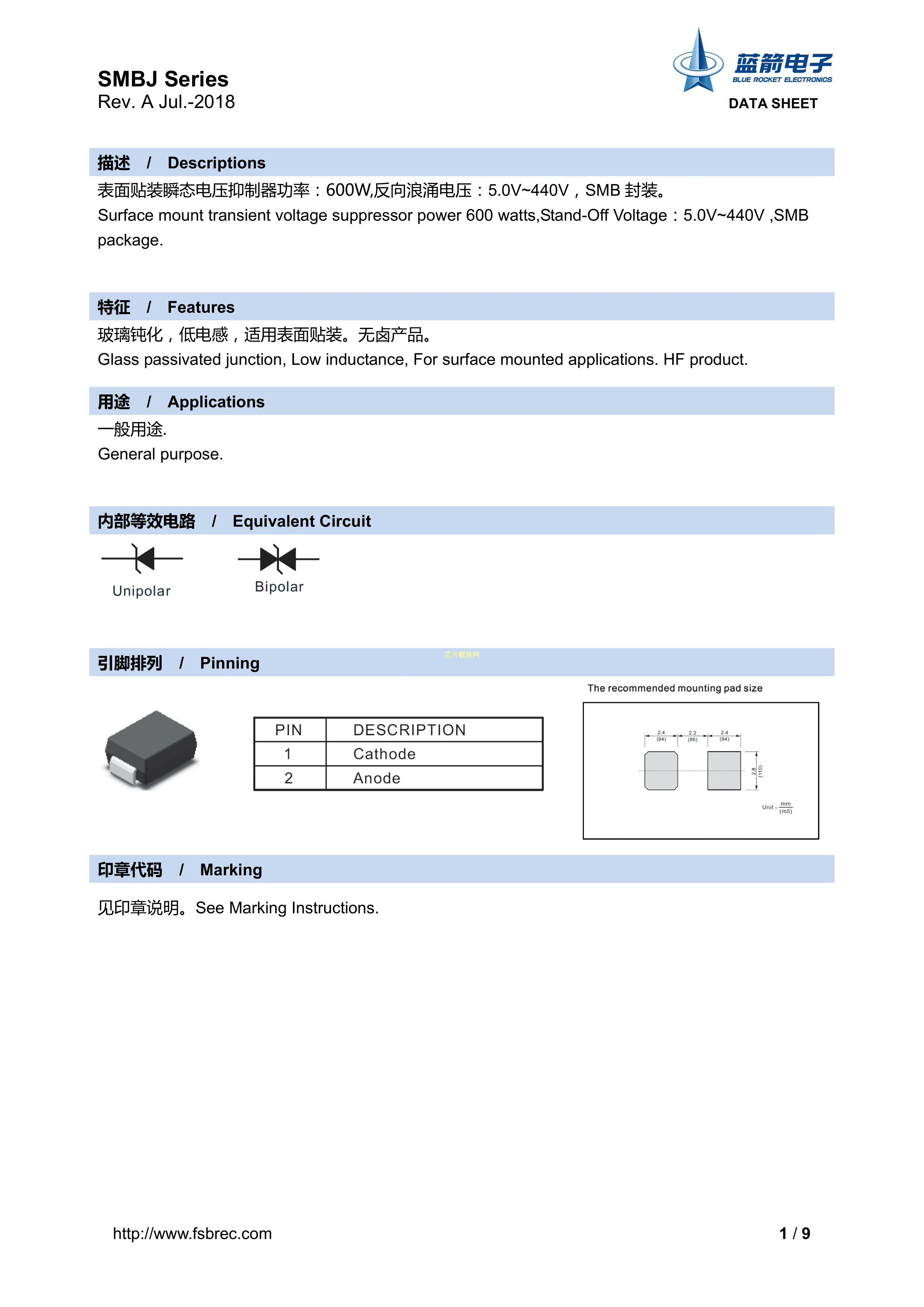 SMBJ70A数据手册SMB封装BLUE ROCKET(蓝箭)PDF规格书,中英文下载
