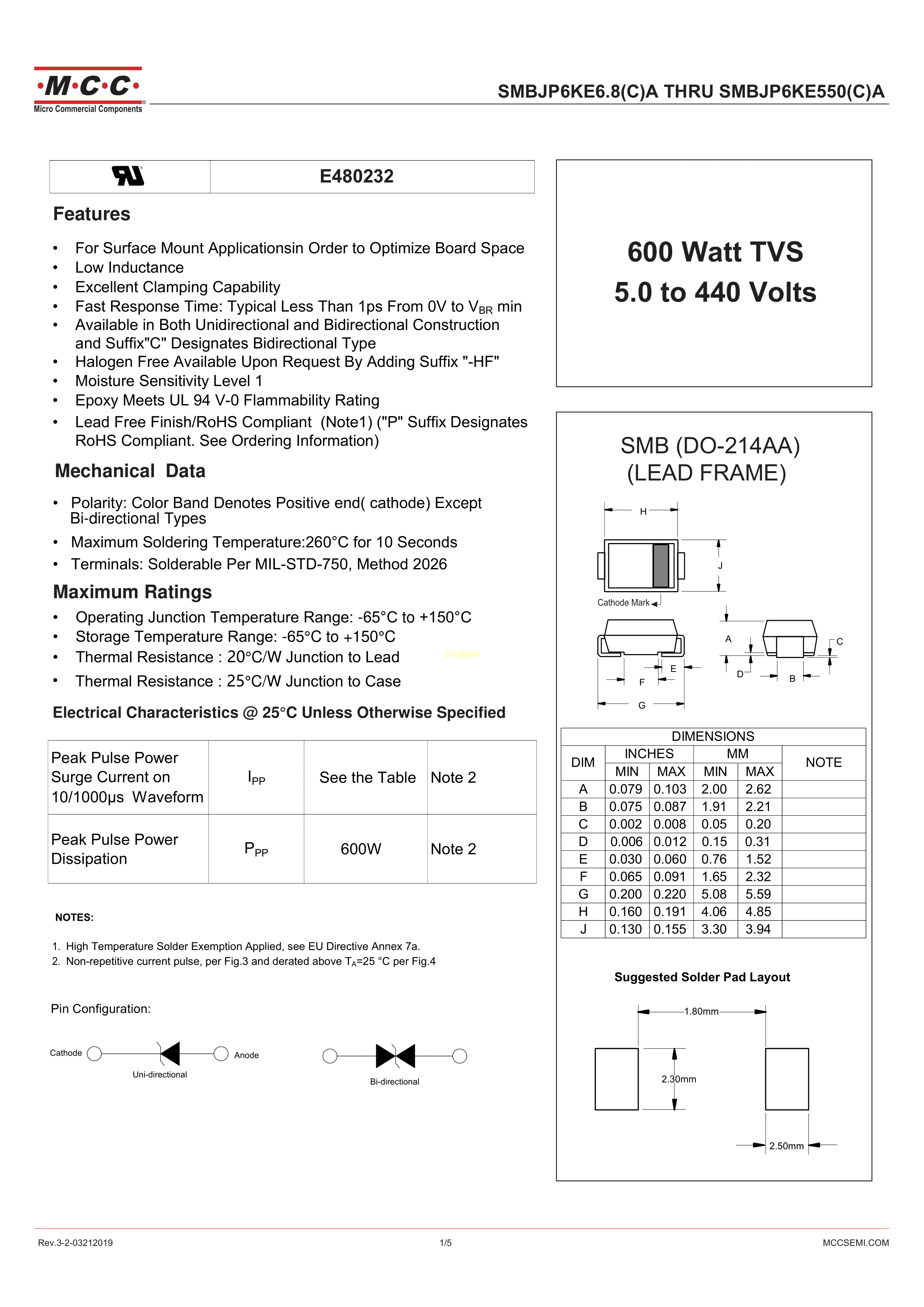 SMBJP6KE180A-TP数据手册SMB封装MCC(美微科)PDF规格书,中英文下载