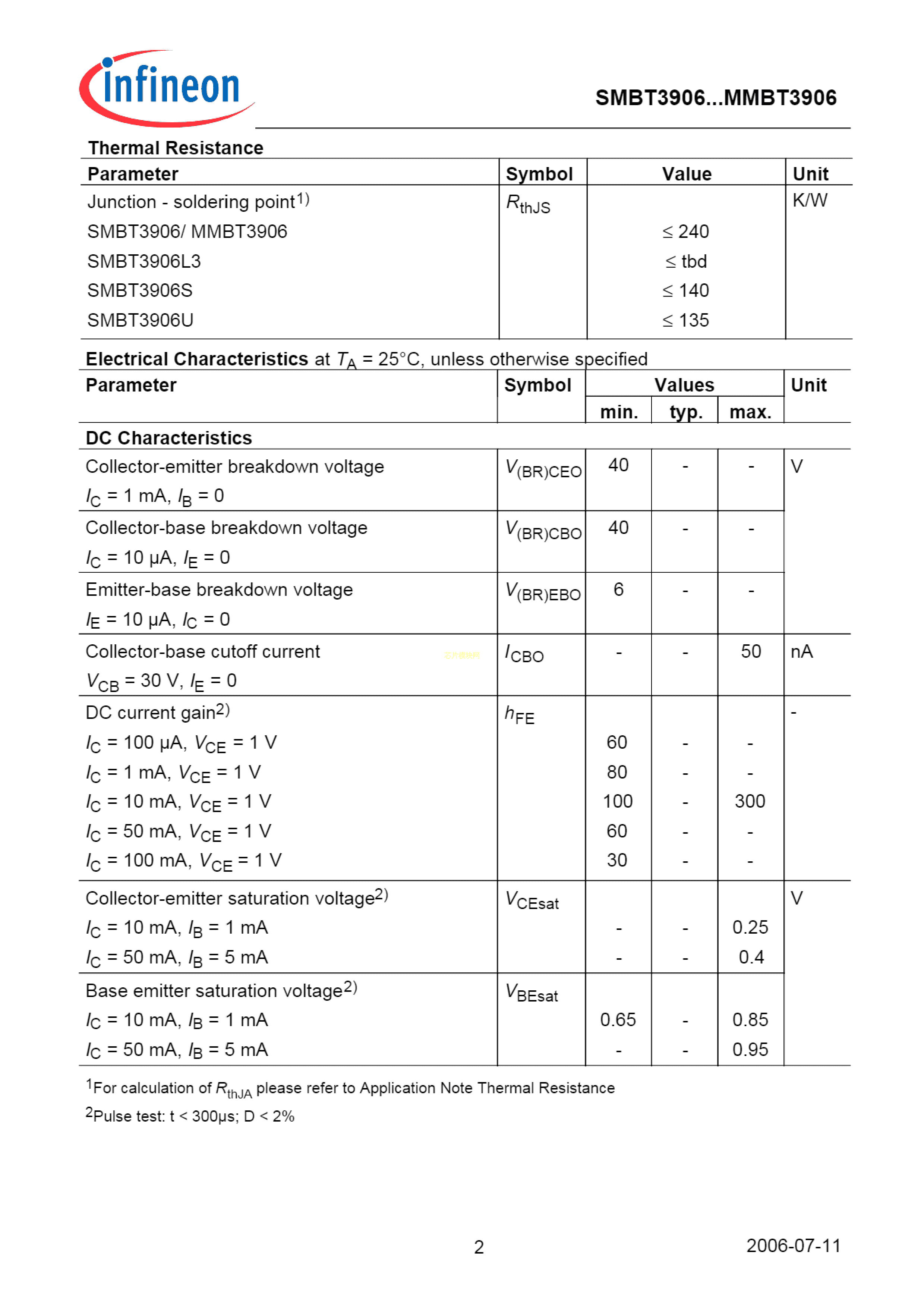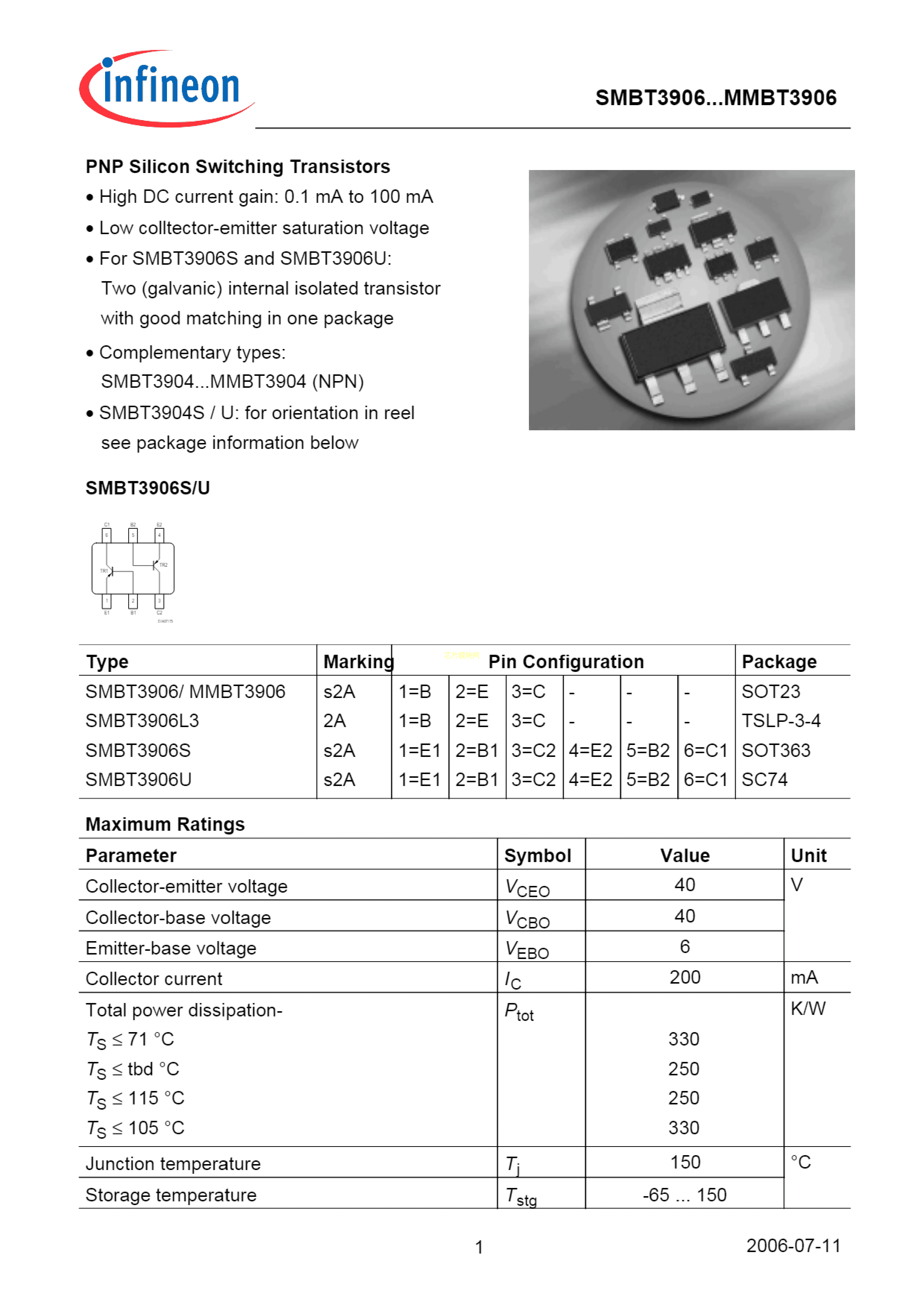 SMBT3906E6327数据手册SOT-23封装Infineon(英飞凌)PDF规格书,中英文下载