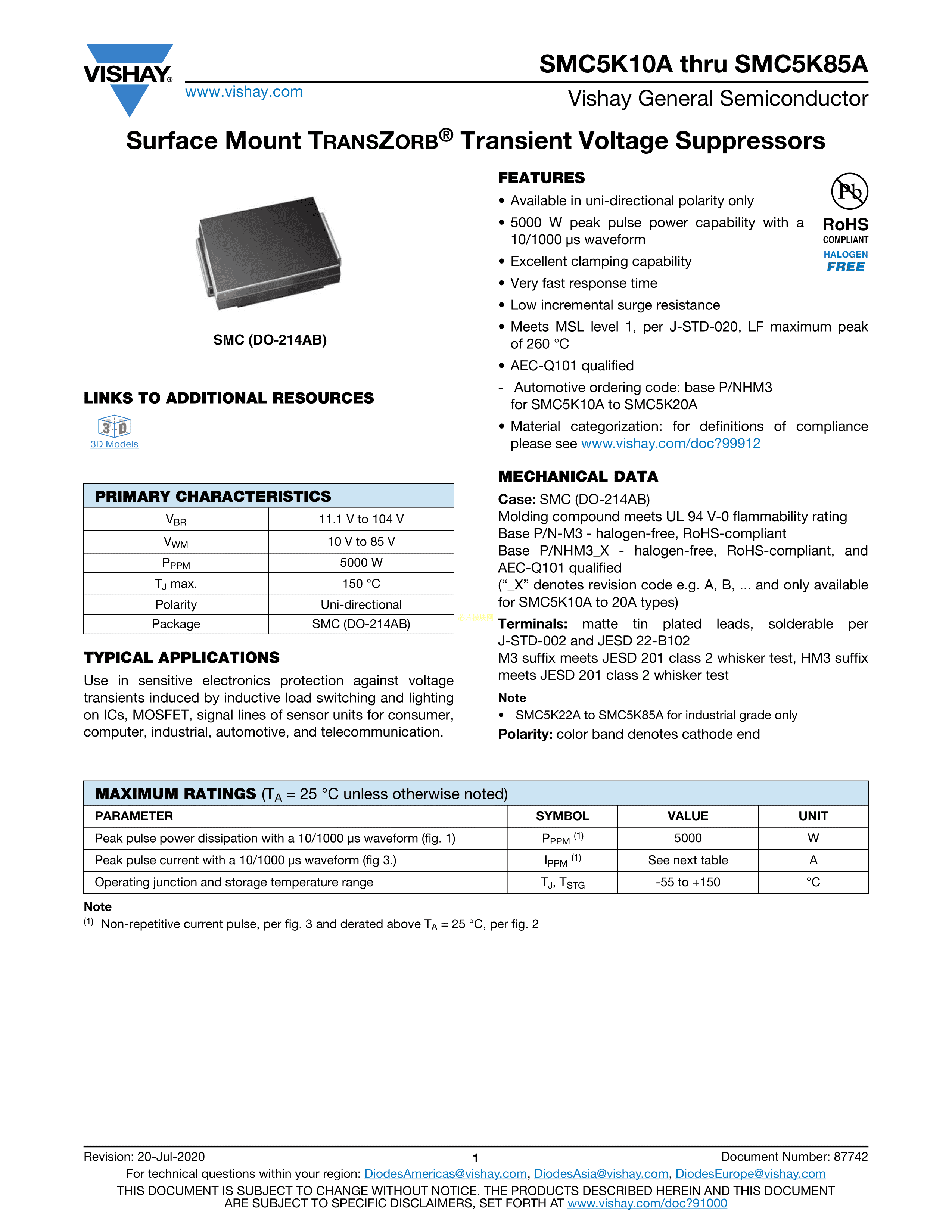 SMC5K17A-M3-H数据手册DO-214AB(SMCJ)封装VISHAY(威世)PDF规格书,