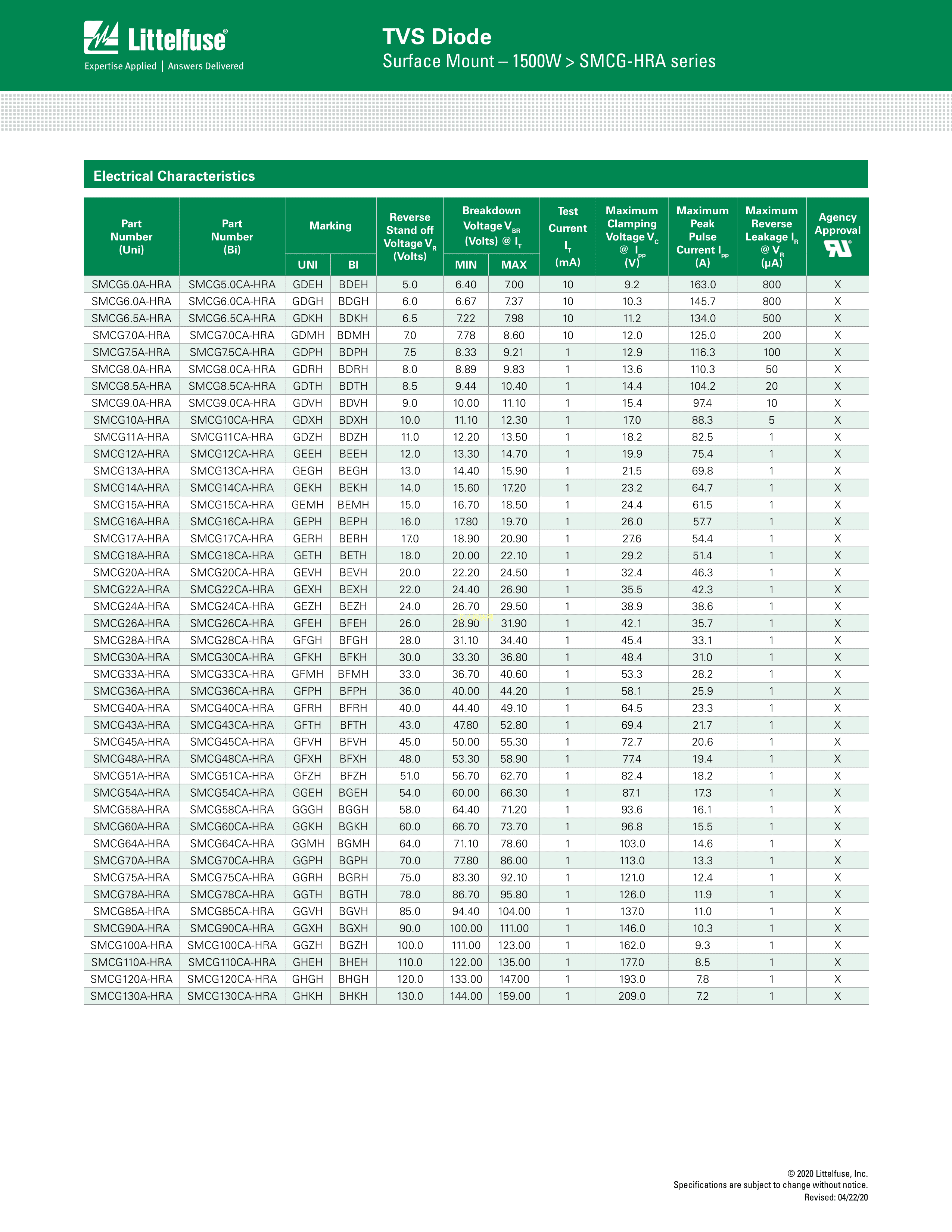 SMCG11CA-HRA数据手册DO-215AB(SMCG)封装Littelfuse(美国力特)PD