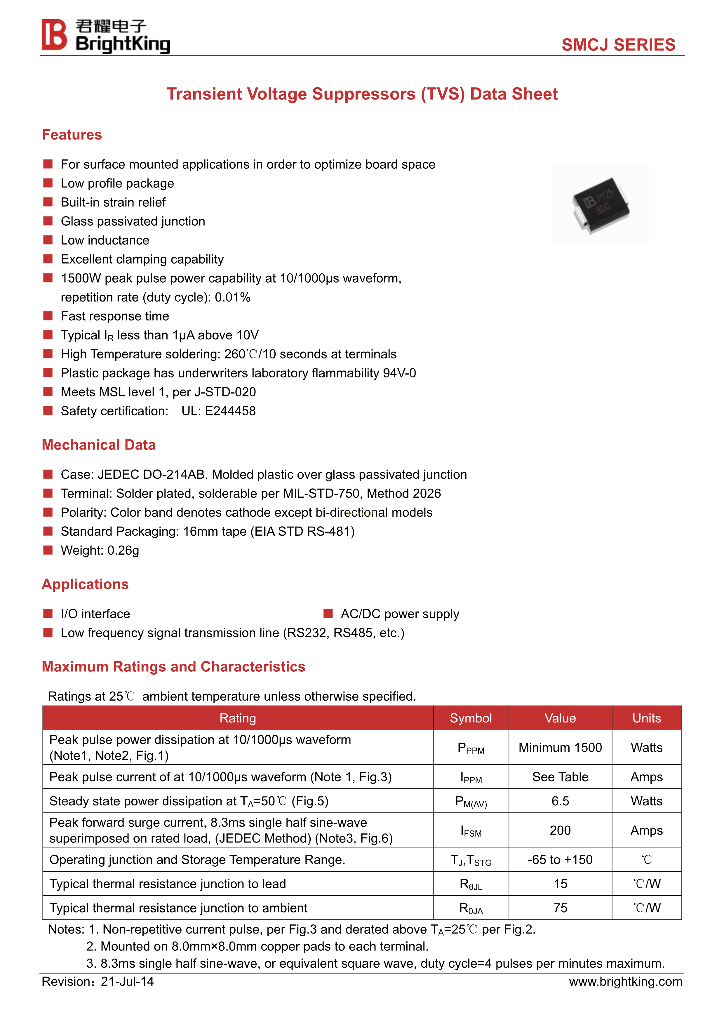 SMCJ110A数据手册SMC封装Brightking(台湾君耀)PDF规格书,中英文下载