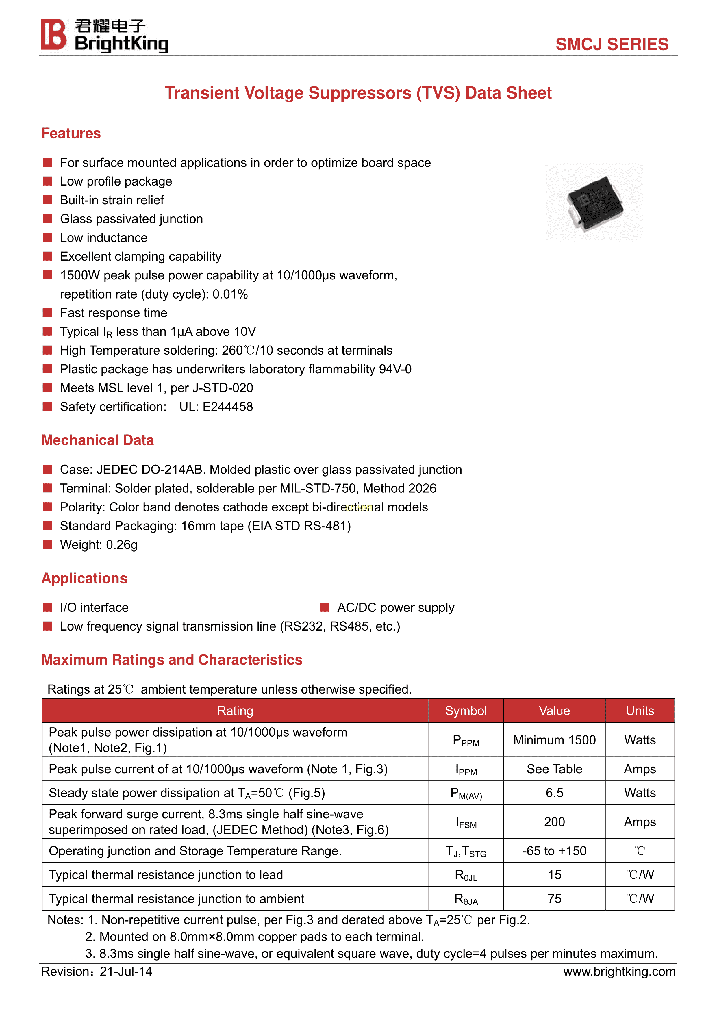 SMCJ110CA数据手册SMC封装Brightking(台湾君耀)PDF规格书,中英文下载