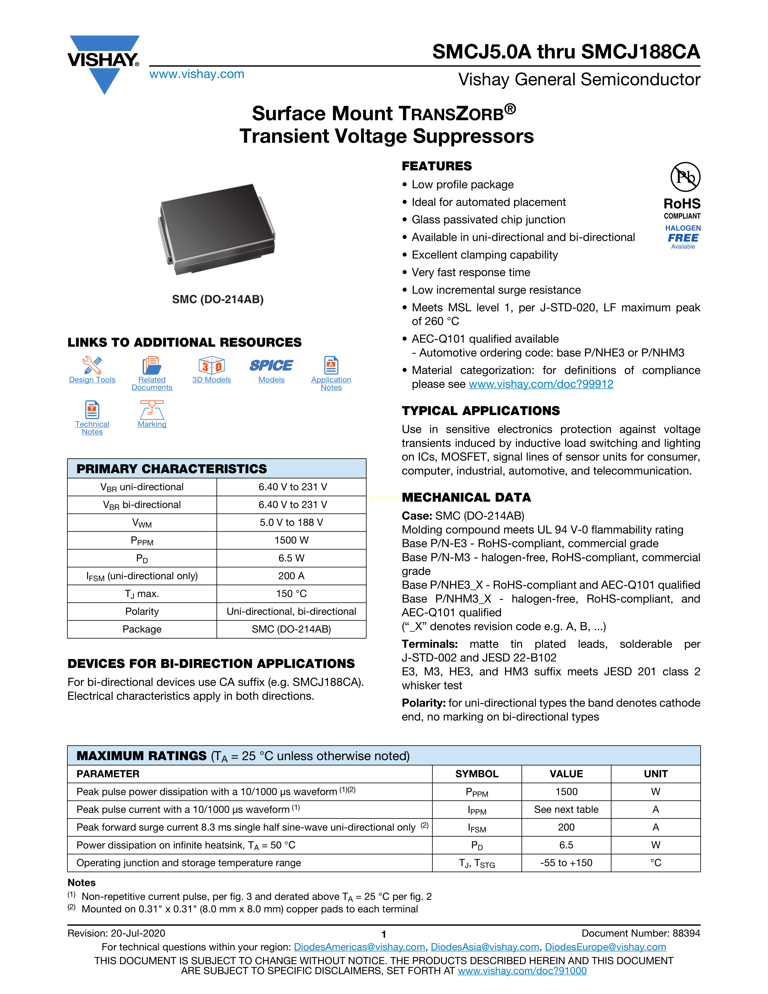 SMCJ130A-E3-57T数据手册DO-214AB(SMCJ)封装VISHAY(威世)PDF规格