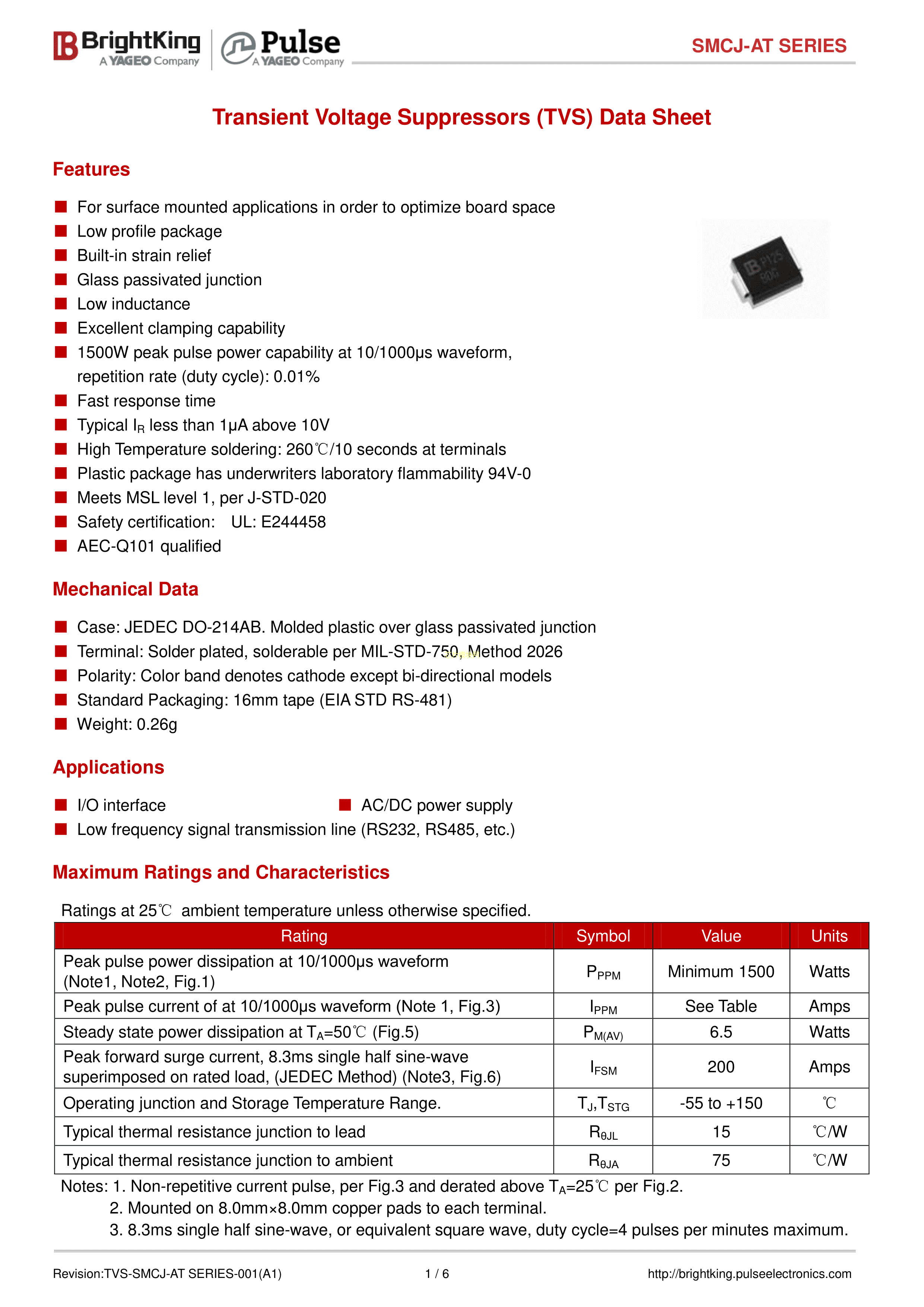 SMCJ130CA-AT数据手册SMC(DO-214AB)封装Brightking(台湾君耀)PDF