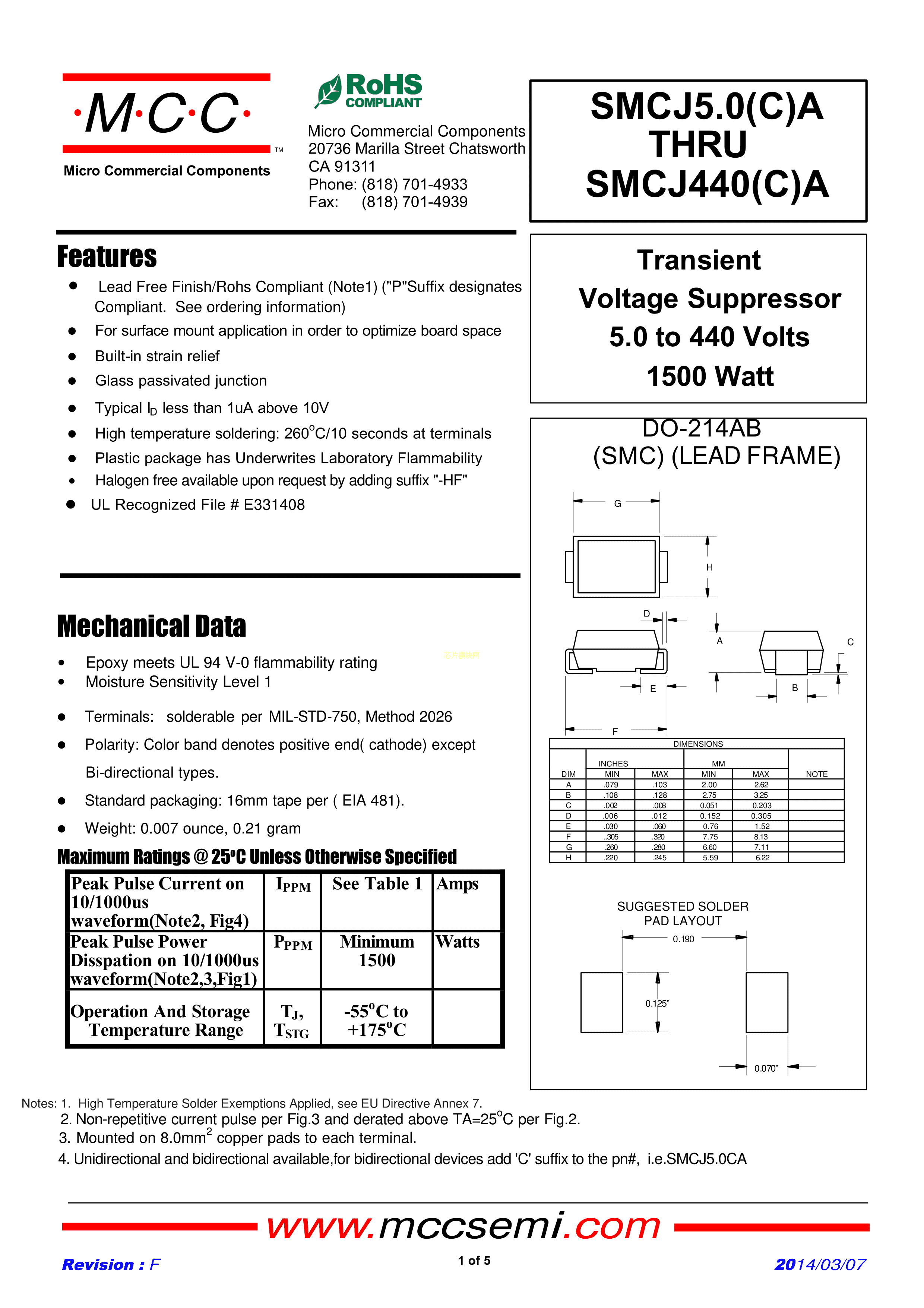 SMCJ13CA-TP数据手册SMC(DO-214AB)封装MCC(美微科)PDF规格书,中英文下载