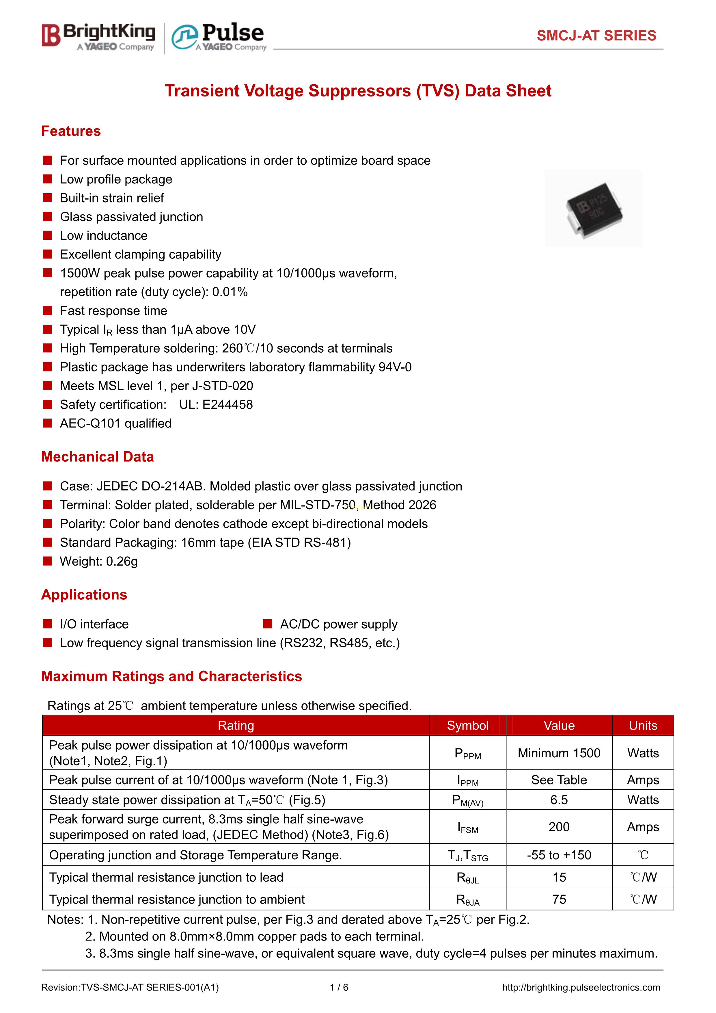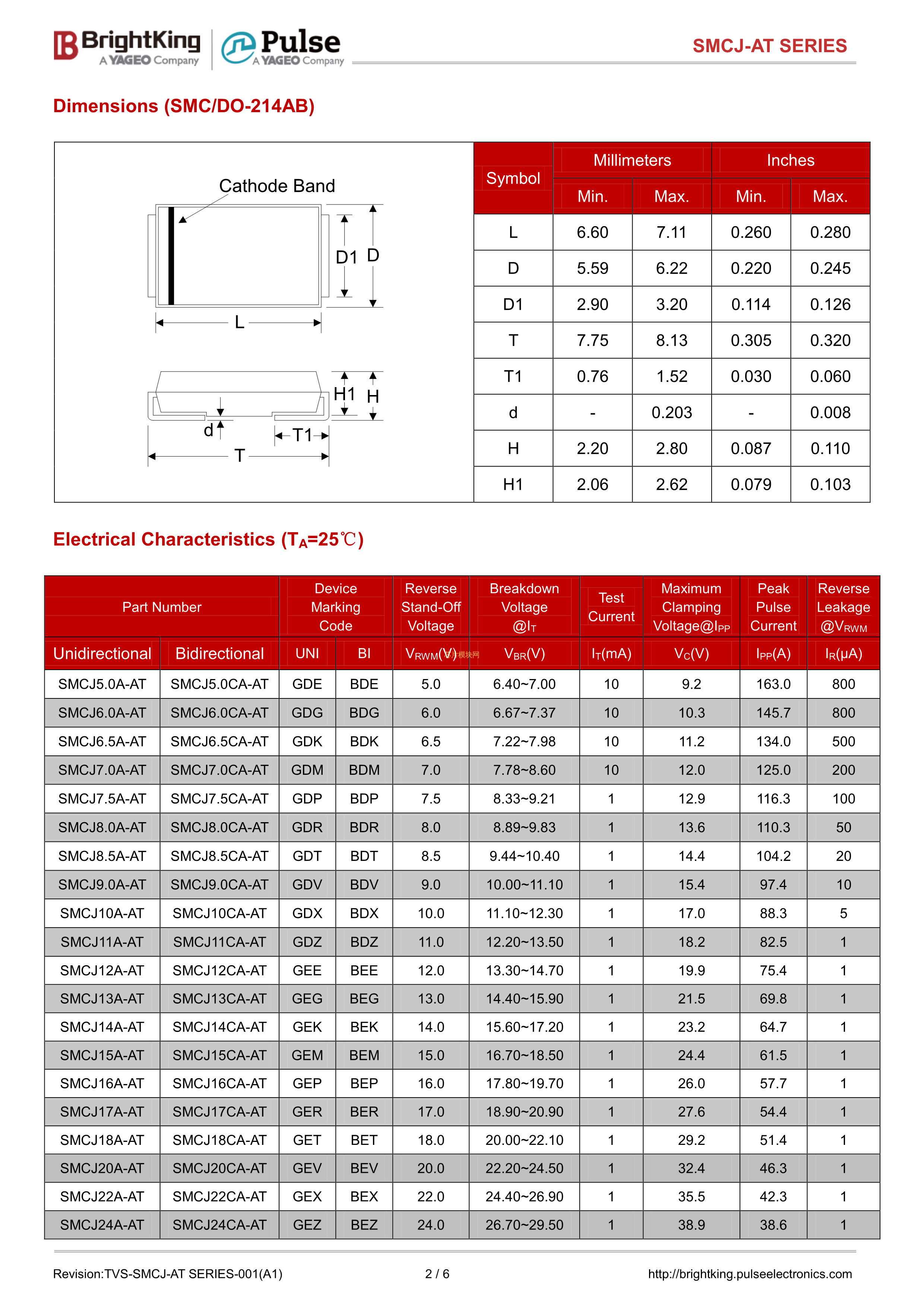 SMCJ18A-AT数据手册SMC(DO-214AB)封装Brightking(台湾君耀)PDF规格