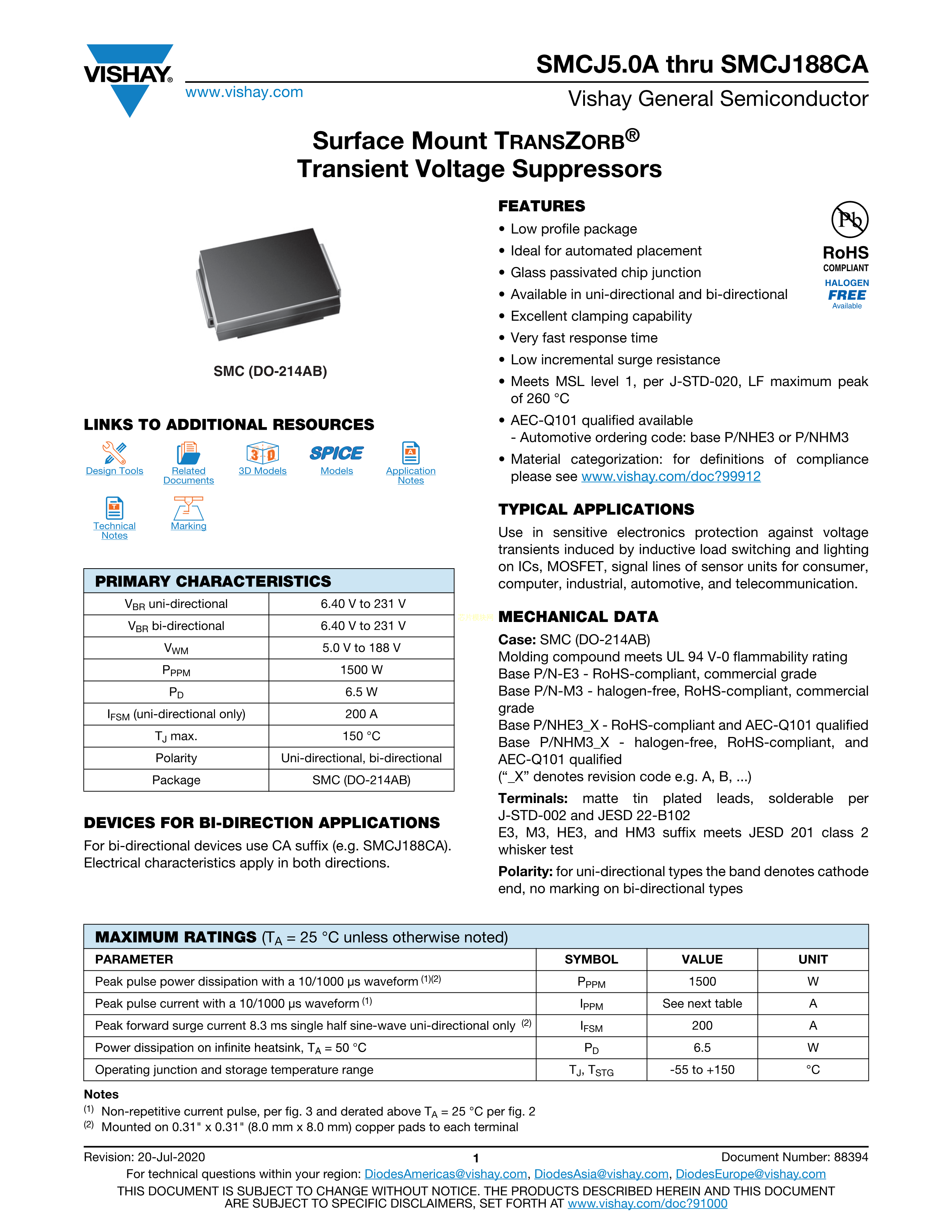 SMCJ18A-E3-57T数据手册DO-214AB(SMCJ)封装VISHAY(威世)PDF规格书