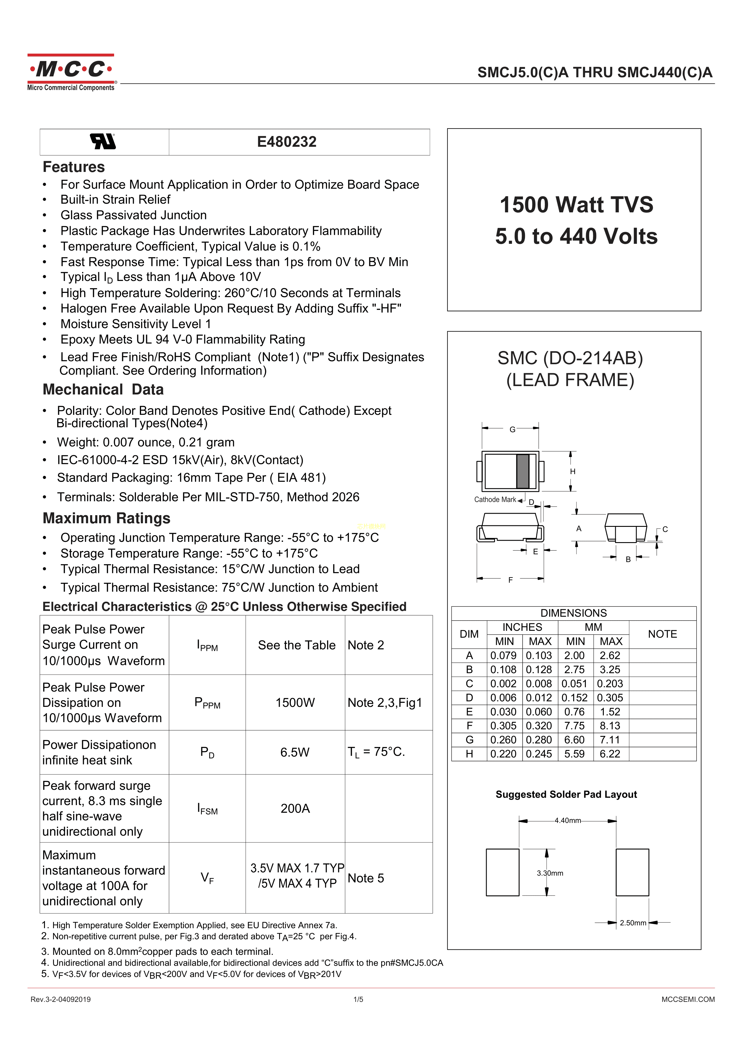 SMCJ200A-TP数据手册SMC封装MCC(美微科)PDF规格书,中英文下载
