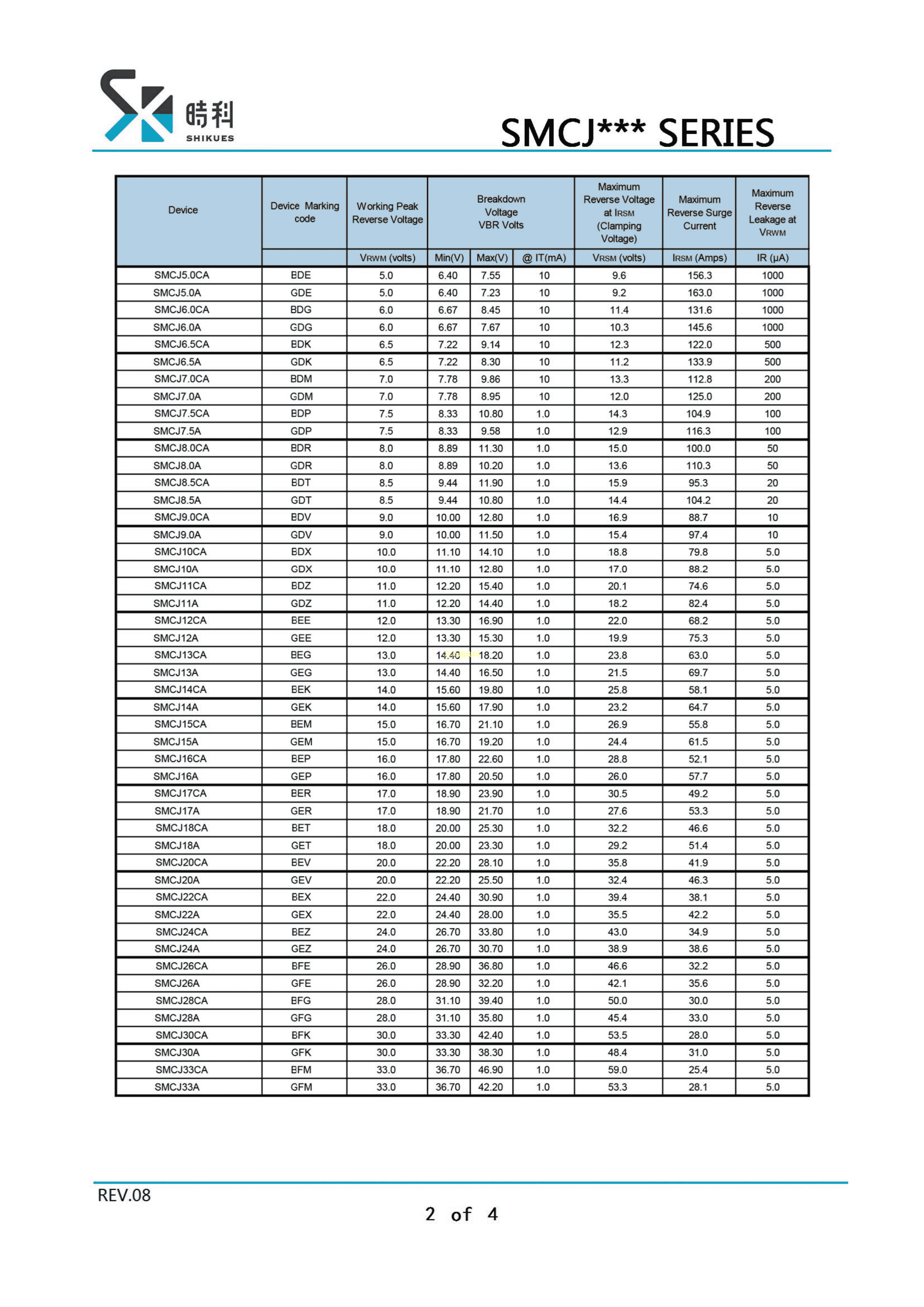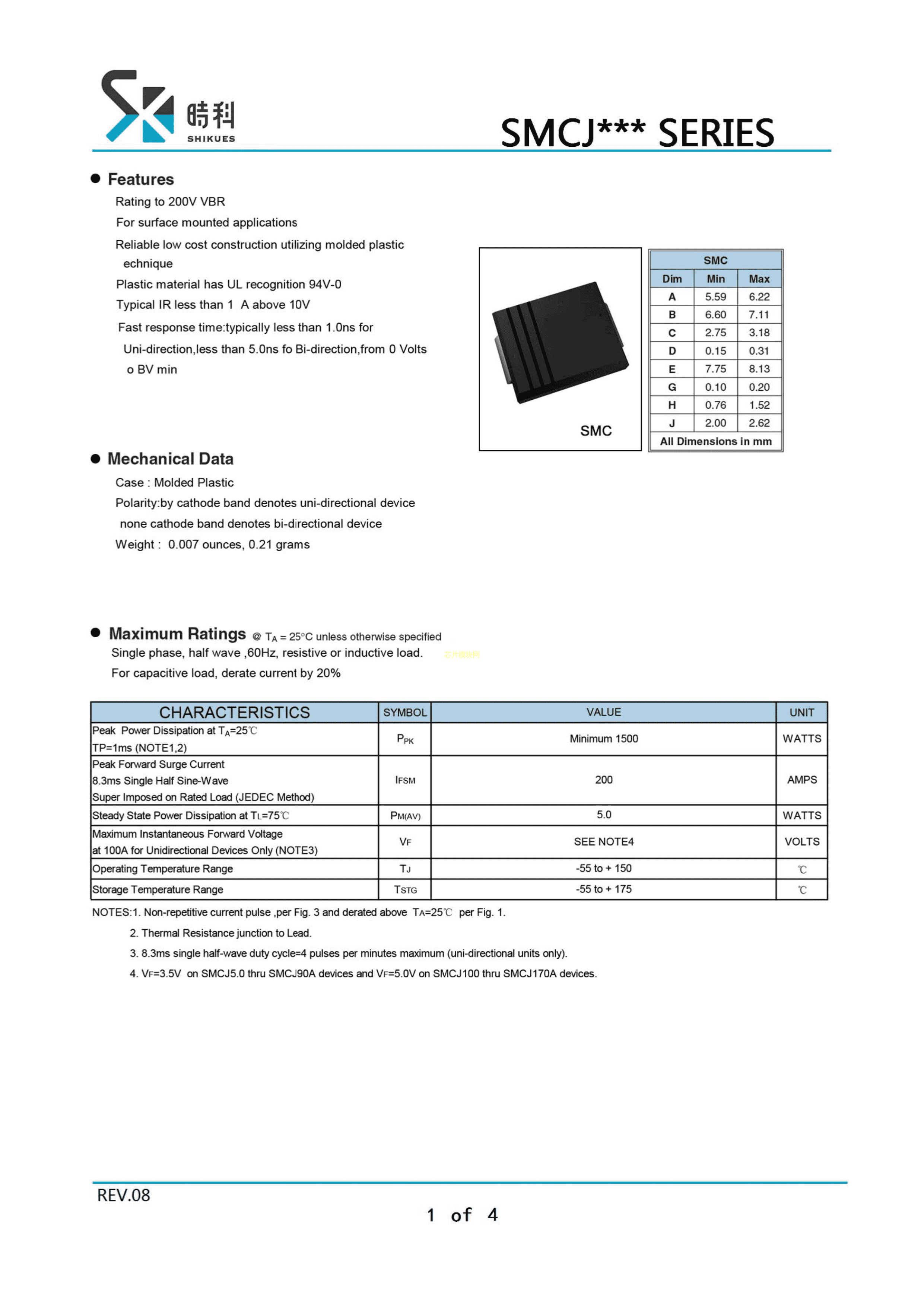 SMCJ22CA数据手册SMC封装SHIKUES(时科)PDF规格书,中英文下载
