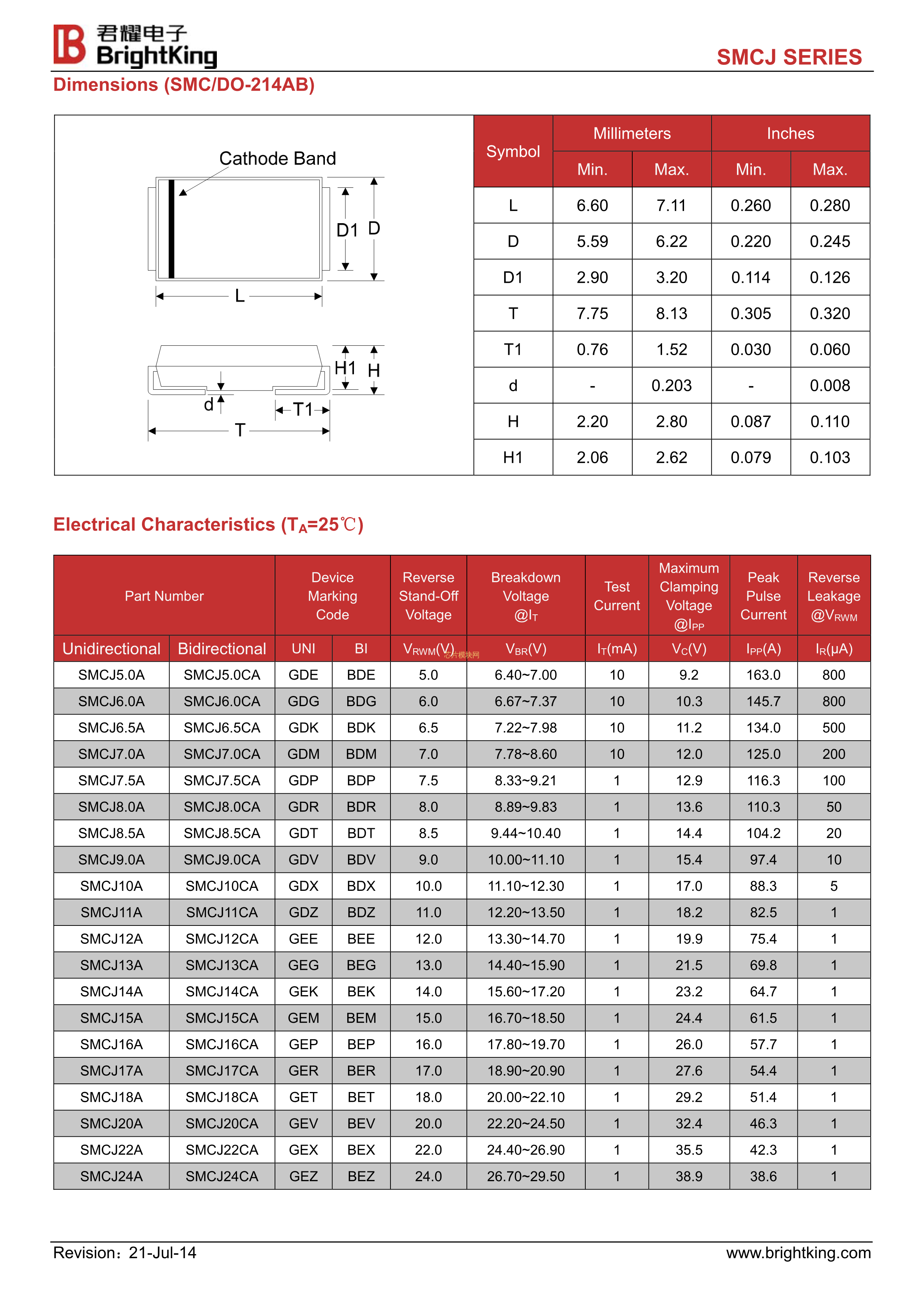 SMCJ24CA数据手册SMC(DO-214AB)封装Brightking(台湾君耀)PDF规格书,