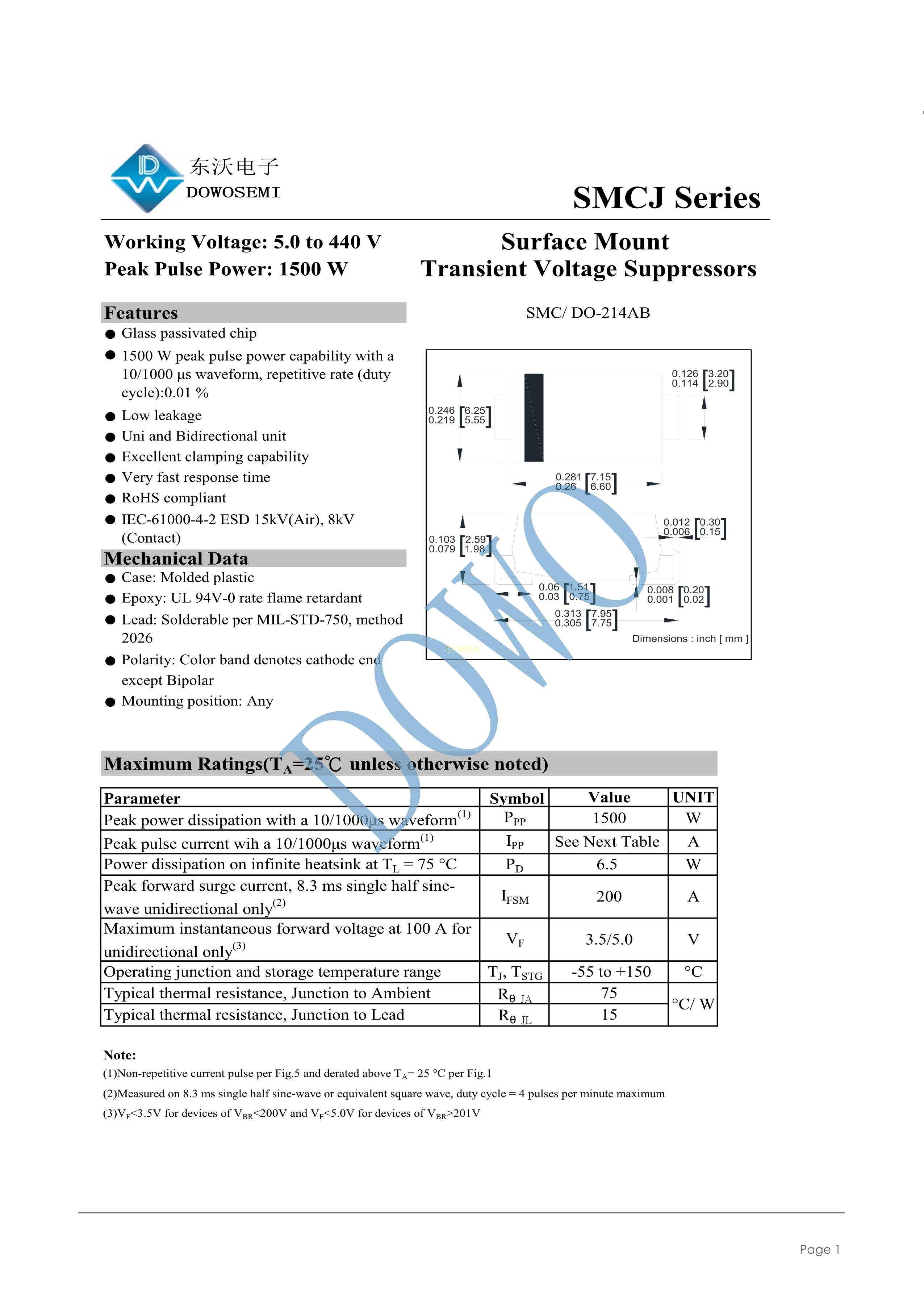 SMCJ24CA数据手册SMC(DO-214AB)封装DOWO(东沃)PDF规格书,中英文下载