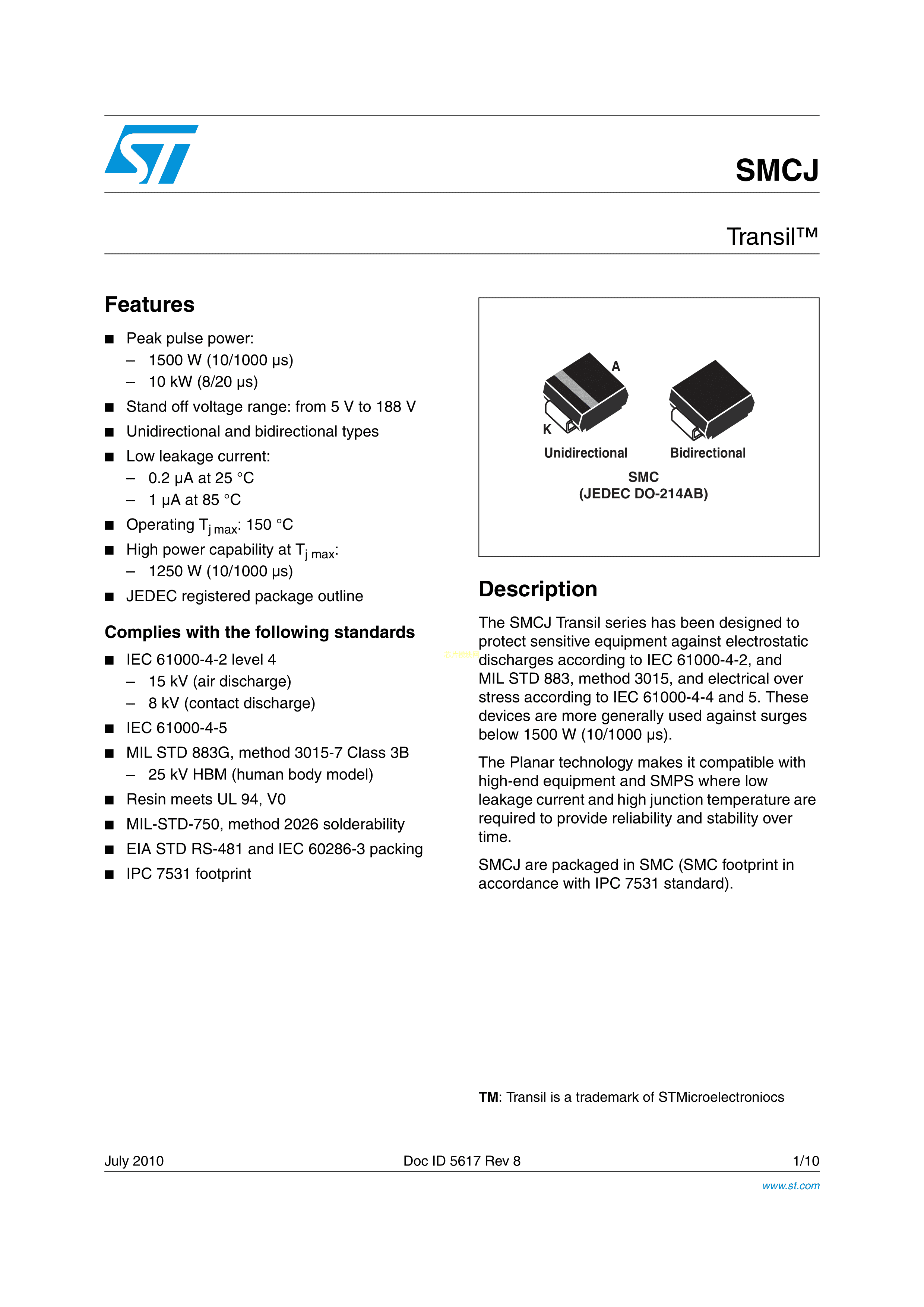 SMCJ26A-TR数据手册SMC(DO-214AB)封装ST(意法半导体)PDF规格书,中英文下载