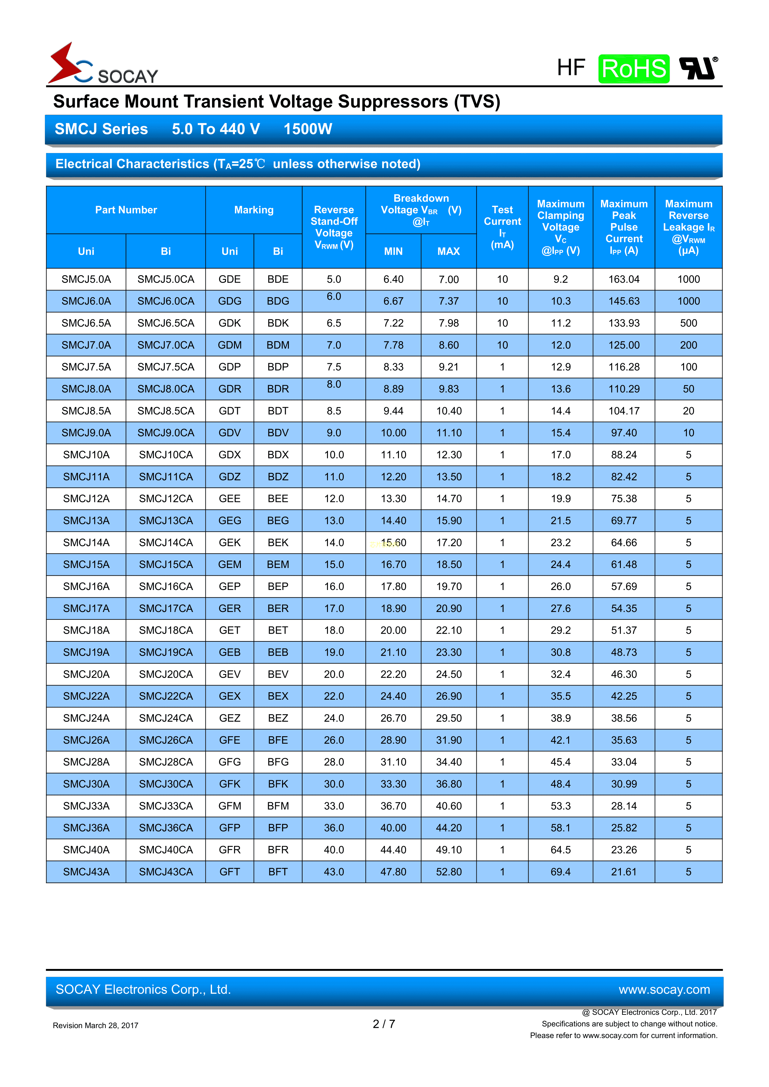 SMCJ30CA数据手册SMC(DO-214AB)封装SOCAY(硕凯)PDF规格书,中英文下载