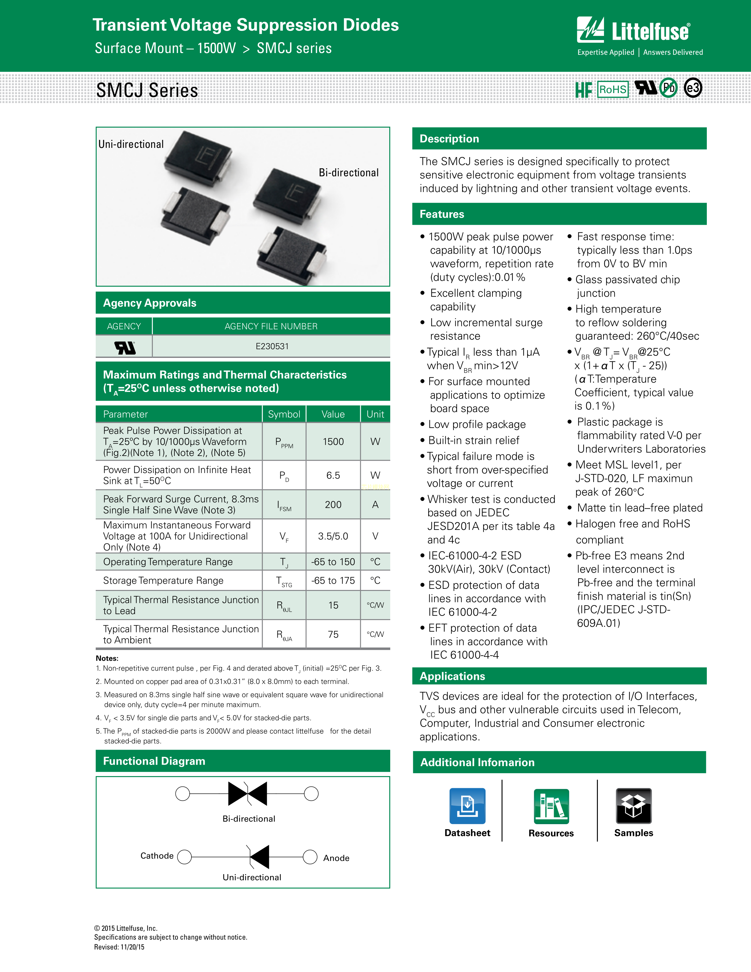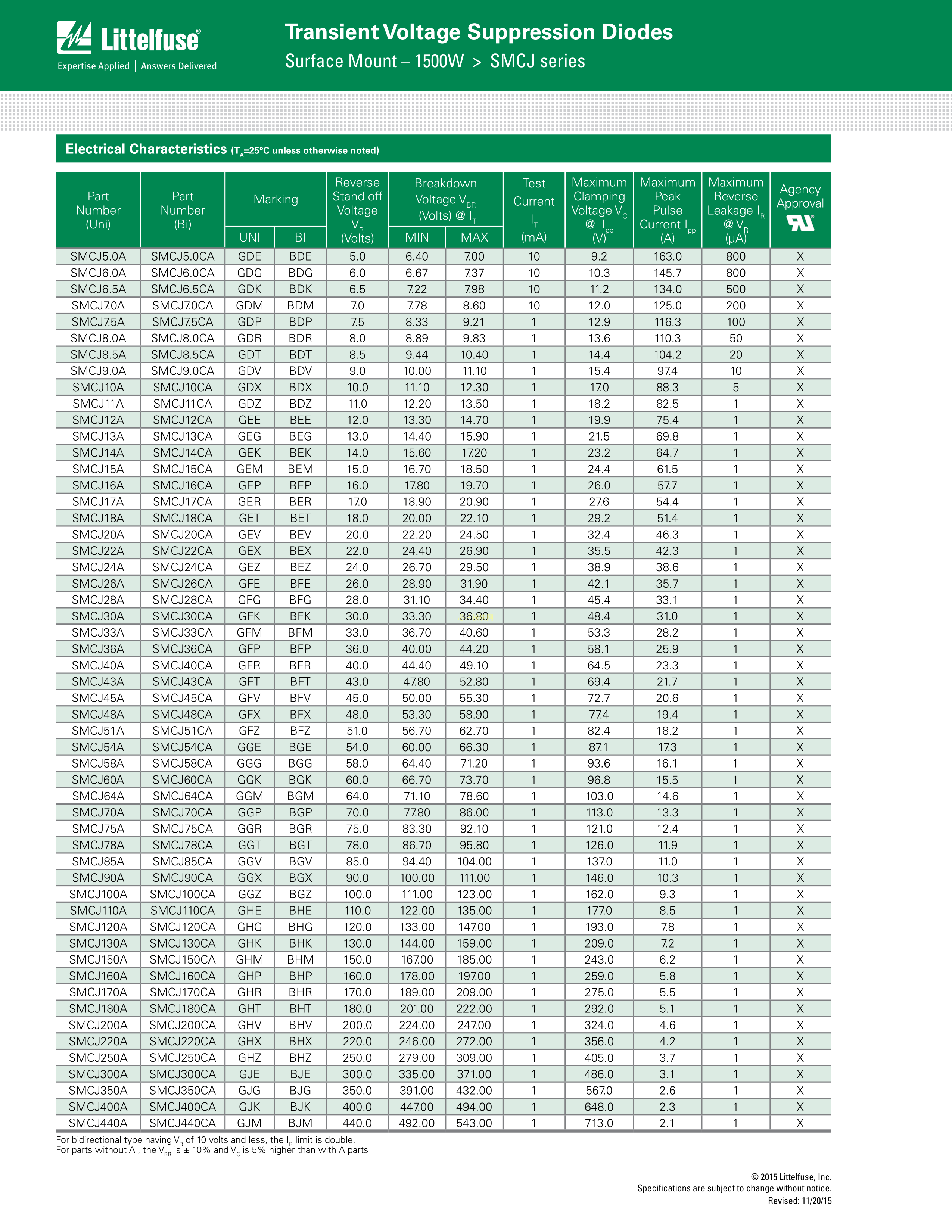 SMCJ36A数据手册SMC(DO-214AB)封装Littelfuse(美国力特)PDF规格书,中