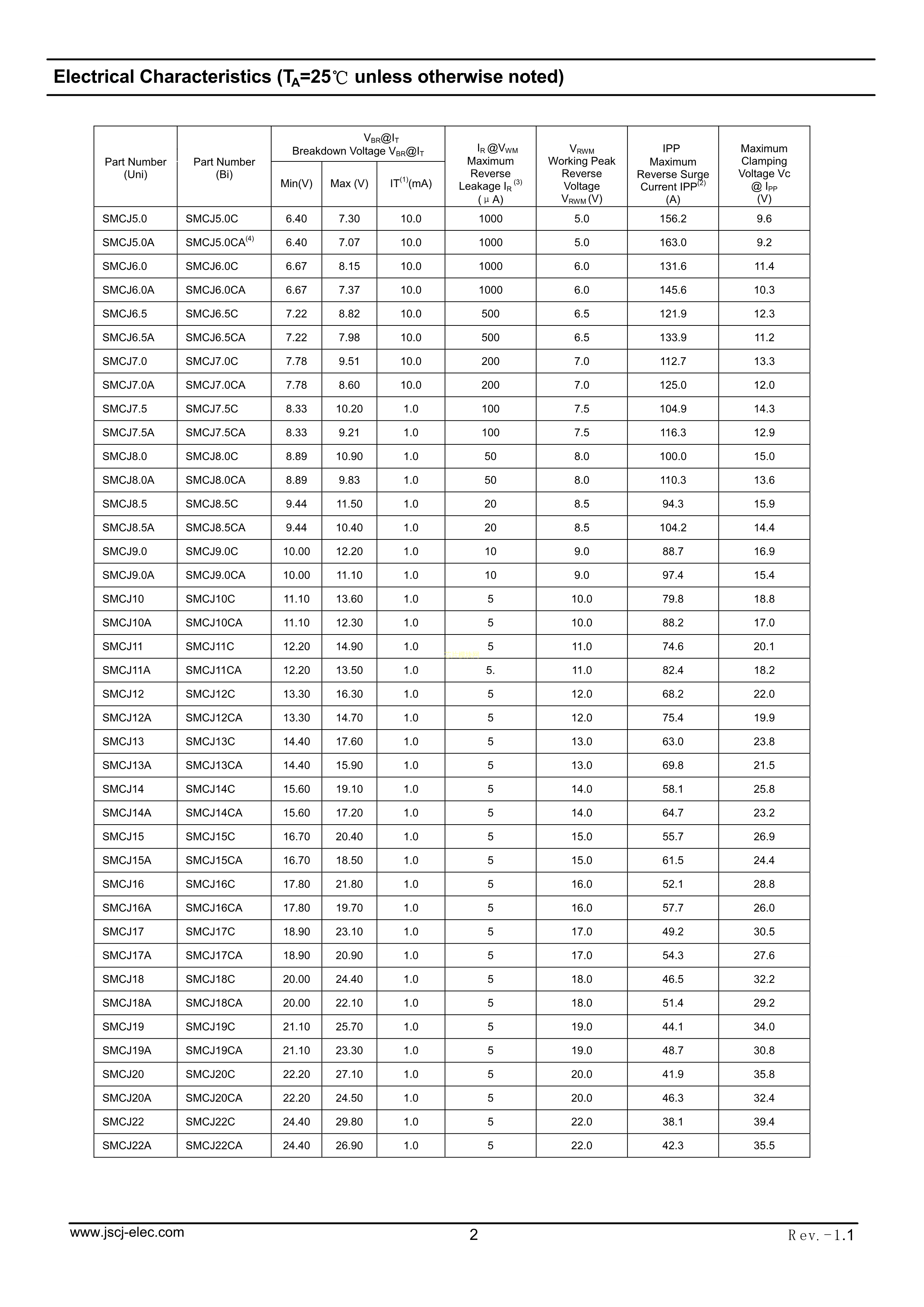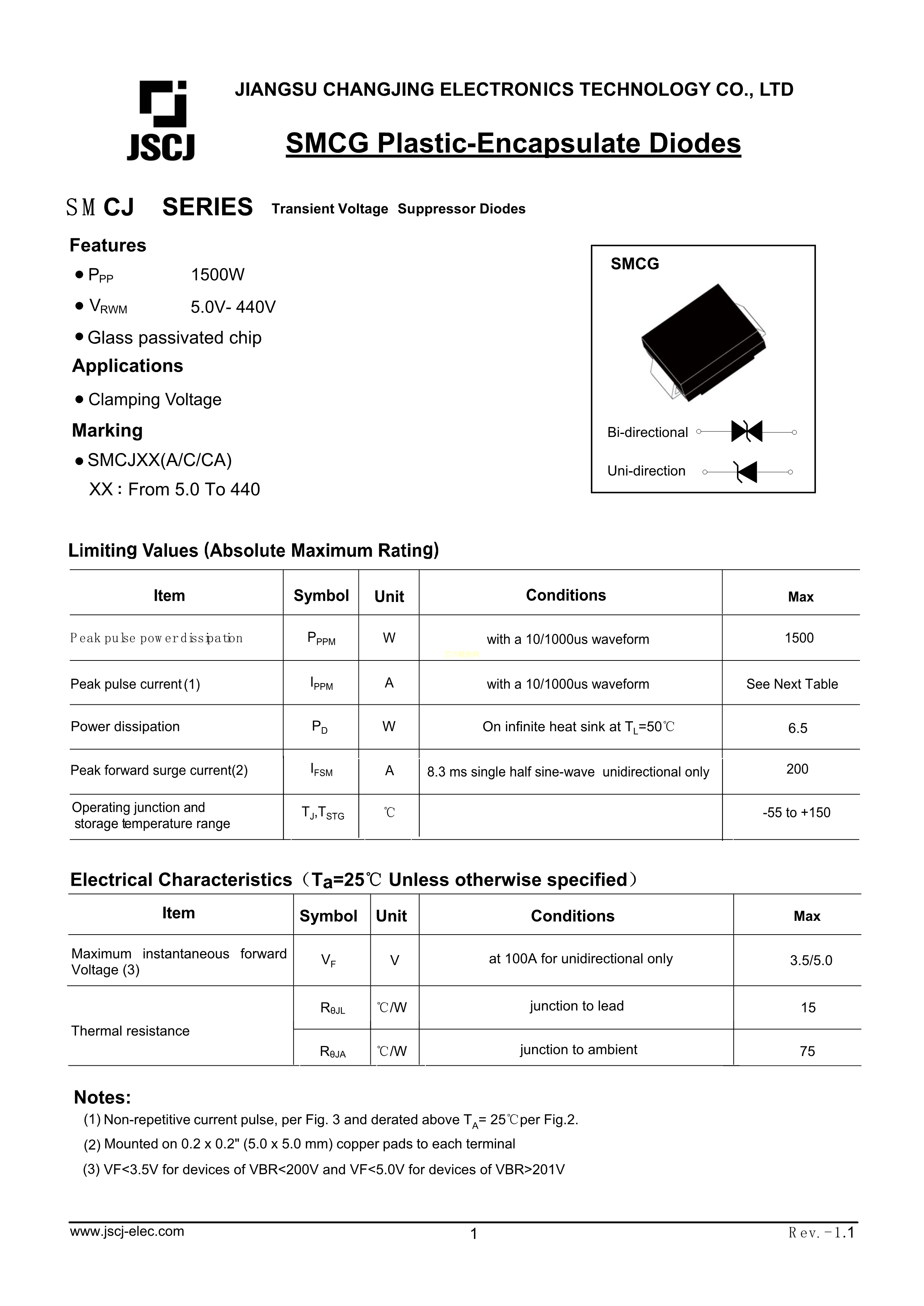 SMCJ60A数据手册SMCG封装CJ(江苏长电-长晶)PDF规格书,中英文下载