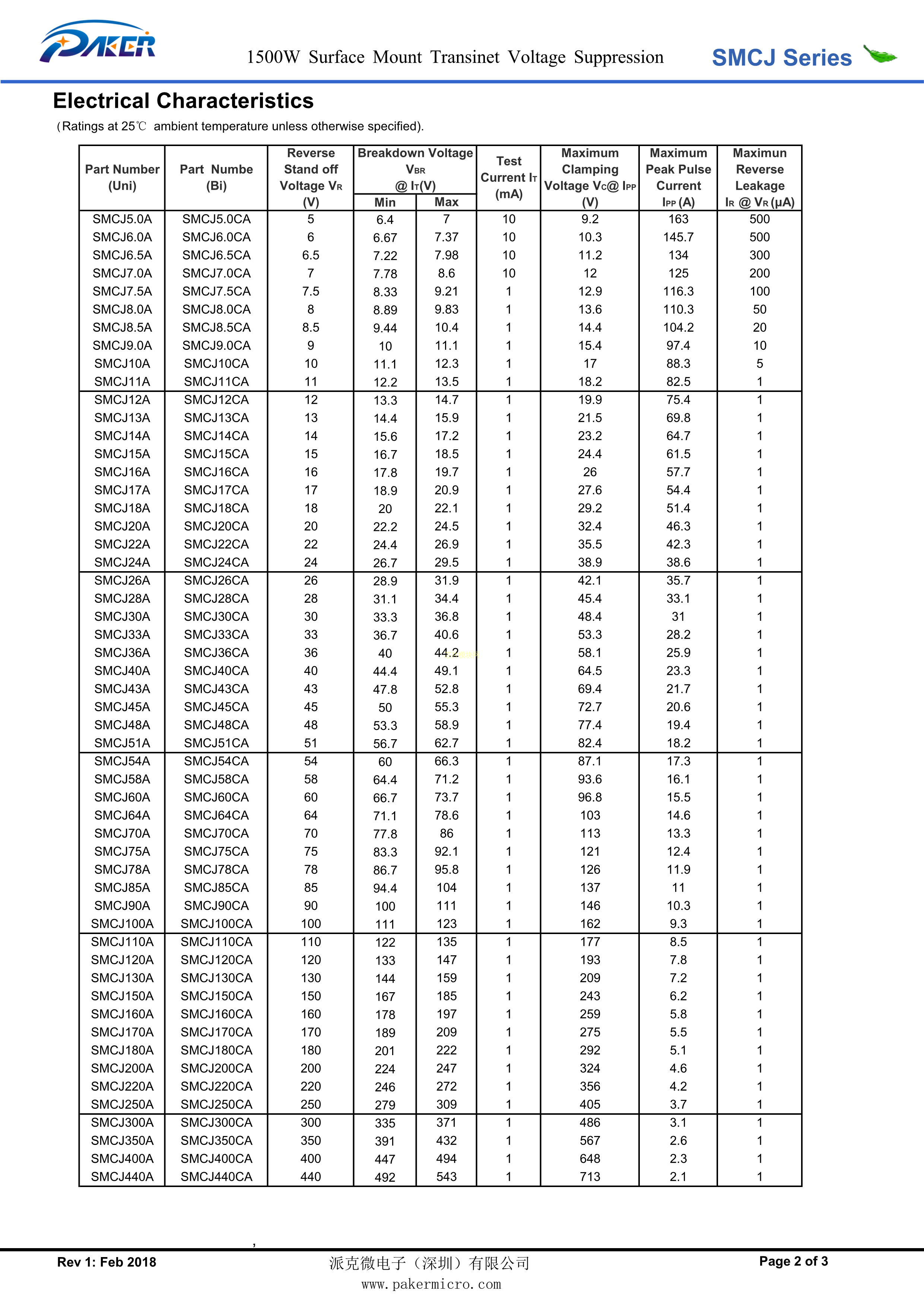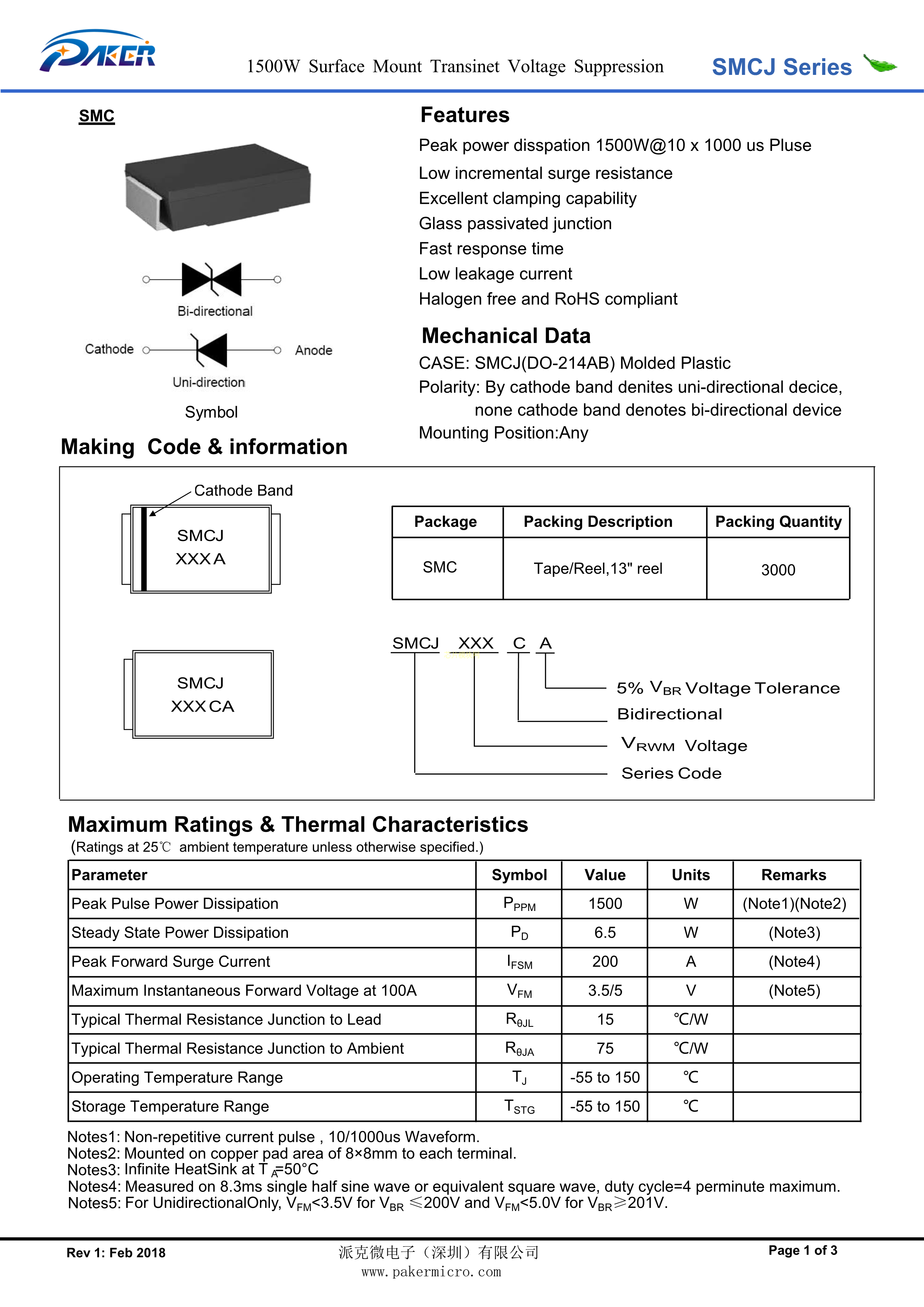 SMCJ70CA数据手册SMC封装PAKER(派克微)PDF规格书,中英文下载