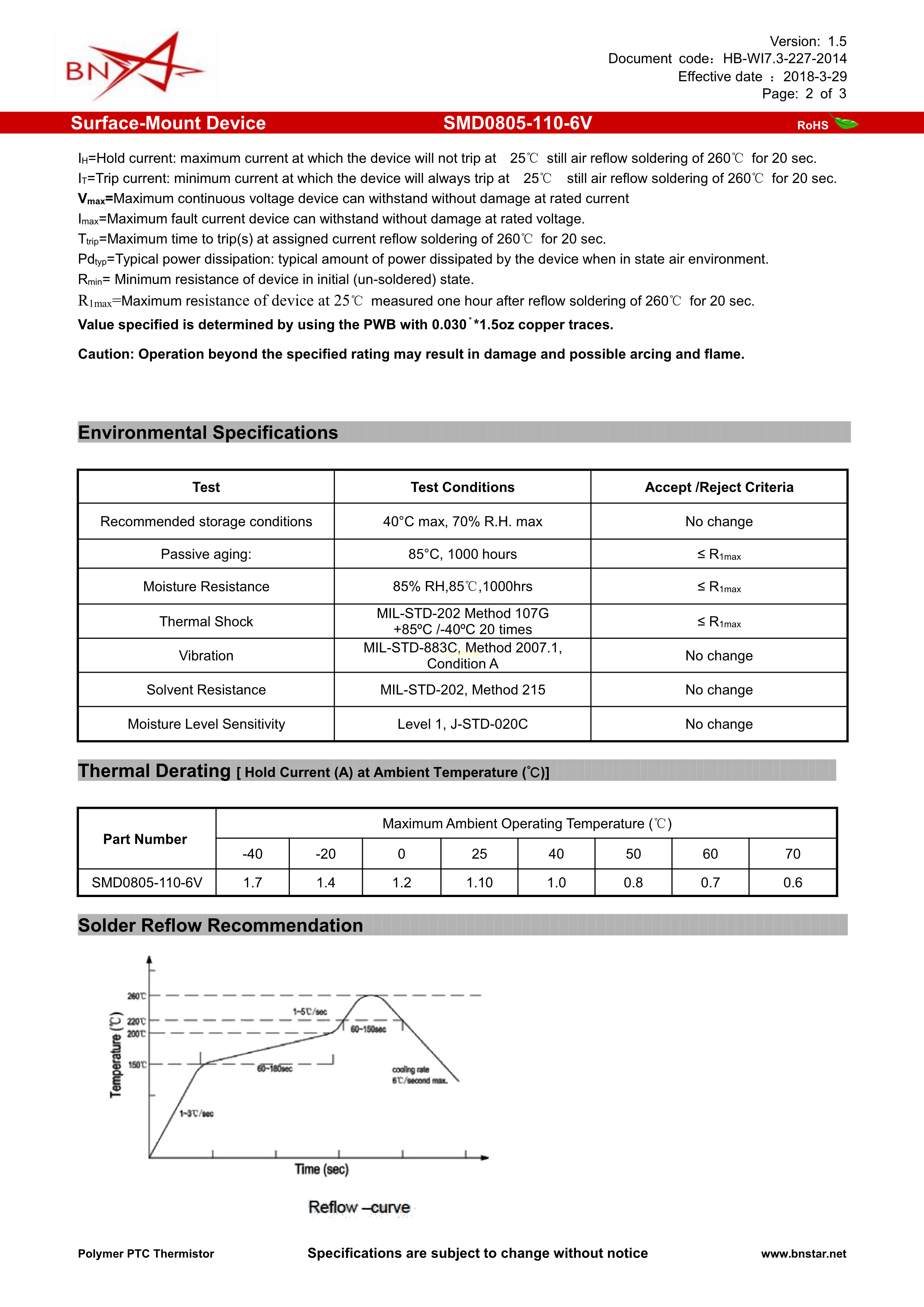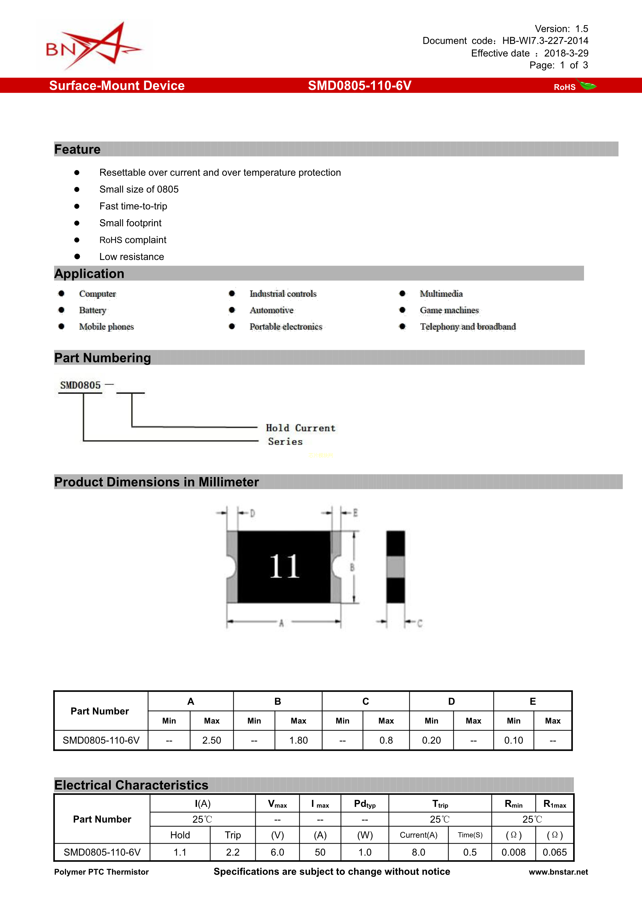 SMD0805-110-6V数据手册0805封装BNstar(比诺星)PDF规格书,中英文下载