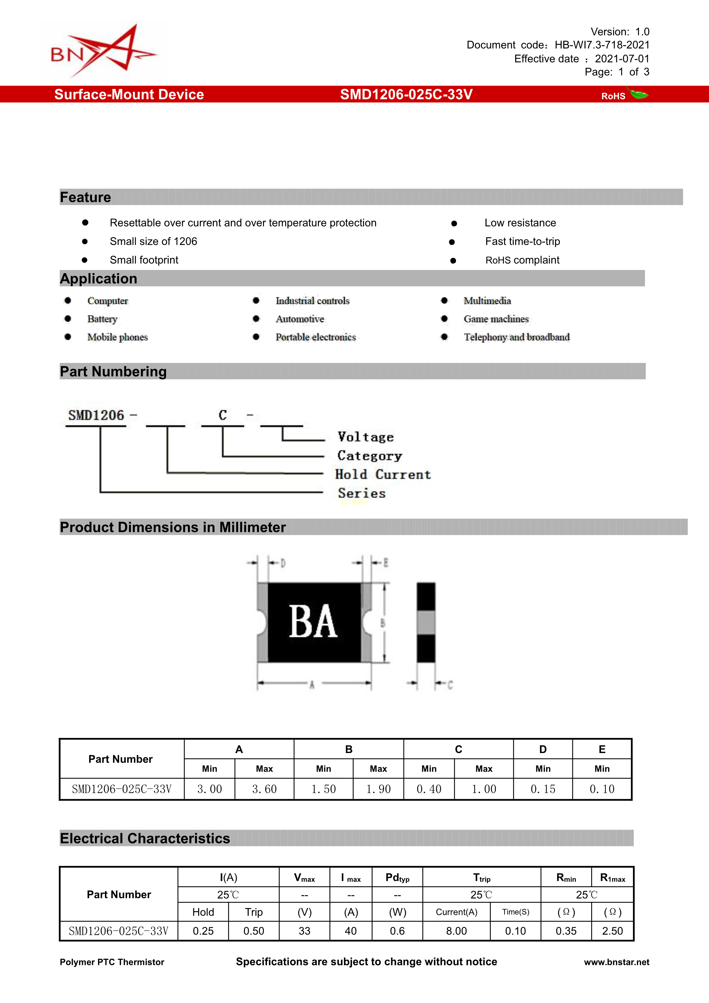 SMD1206-025C-33V数据手册SMD3.6x1.9x1mm封装BNstar(比诺星)PDF