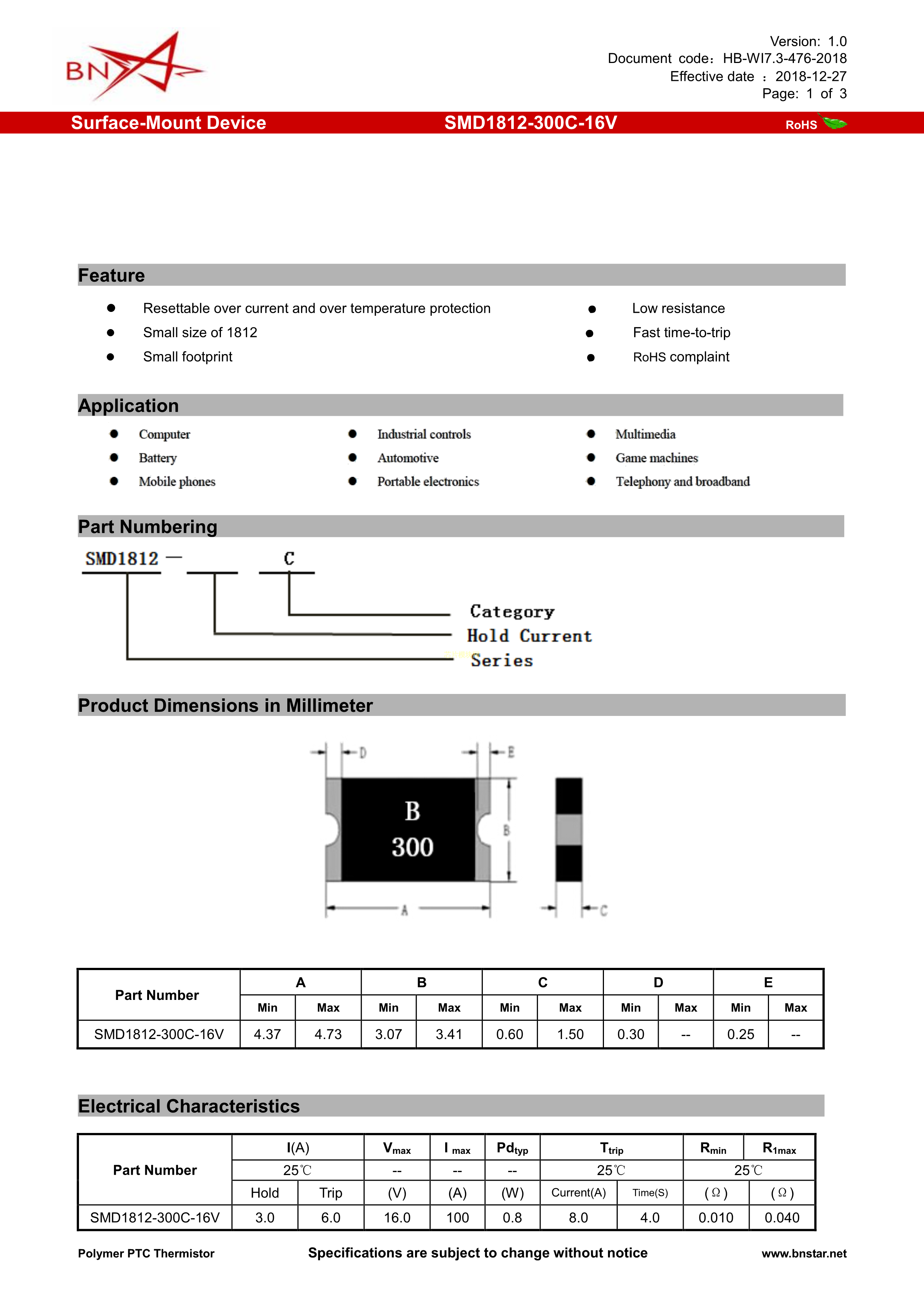 SMD1812-300C-16V数据手册1812封装BNstar(比诺星)PDF规格书,中英文下载