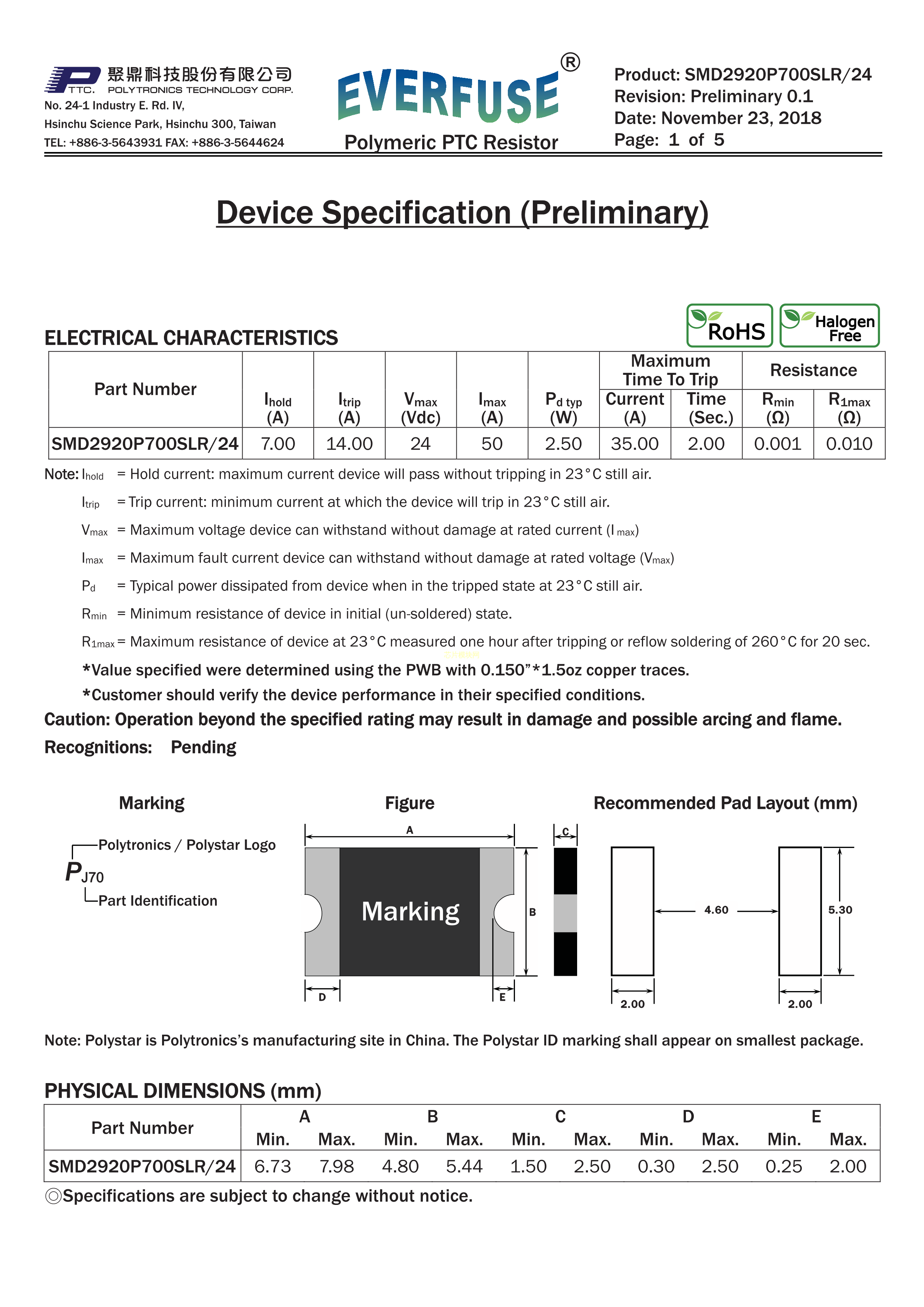 SMD2920P700SLR-24数据手册2920封装PTTC(聚鼎)PDF规格书,中英文下载