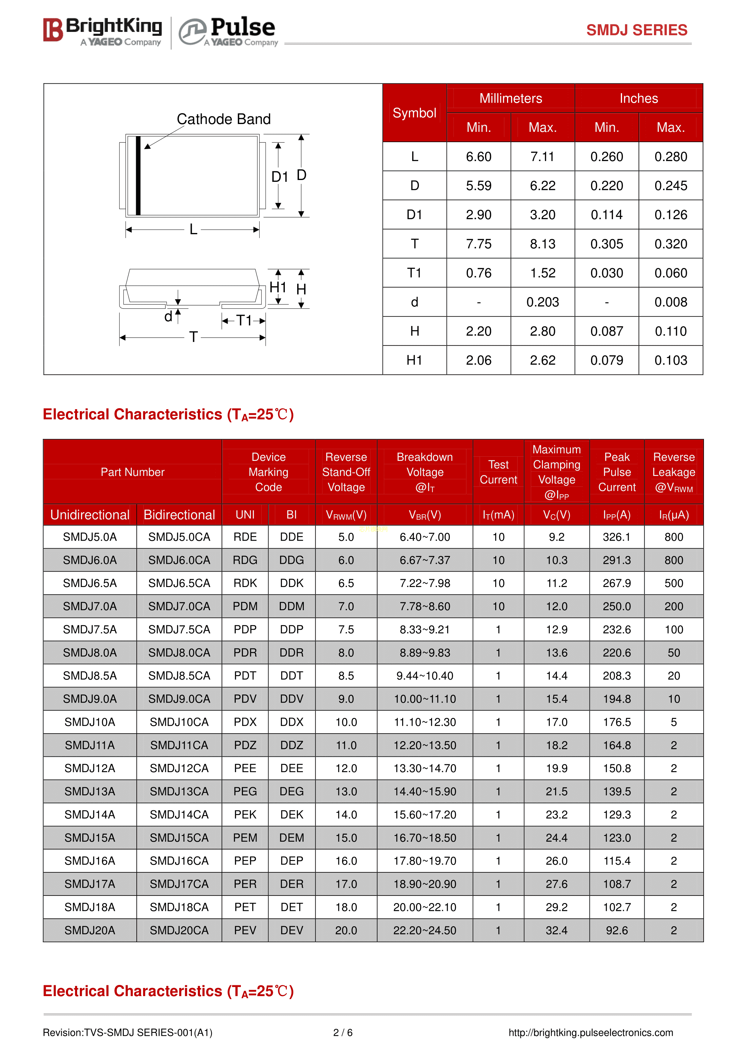 SMDJ13CA数据手册SMC(DO-214AB)封装Brightking(台湾君耀)PDF规格书,