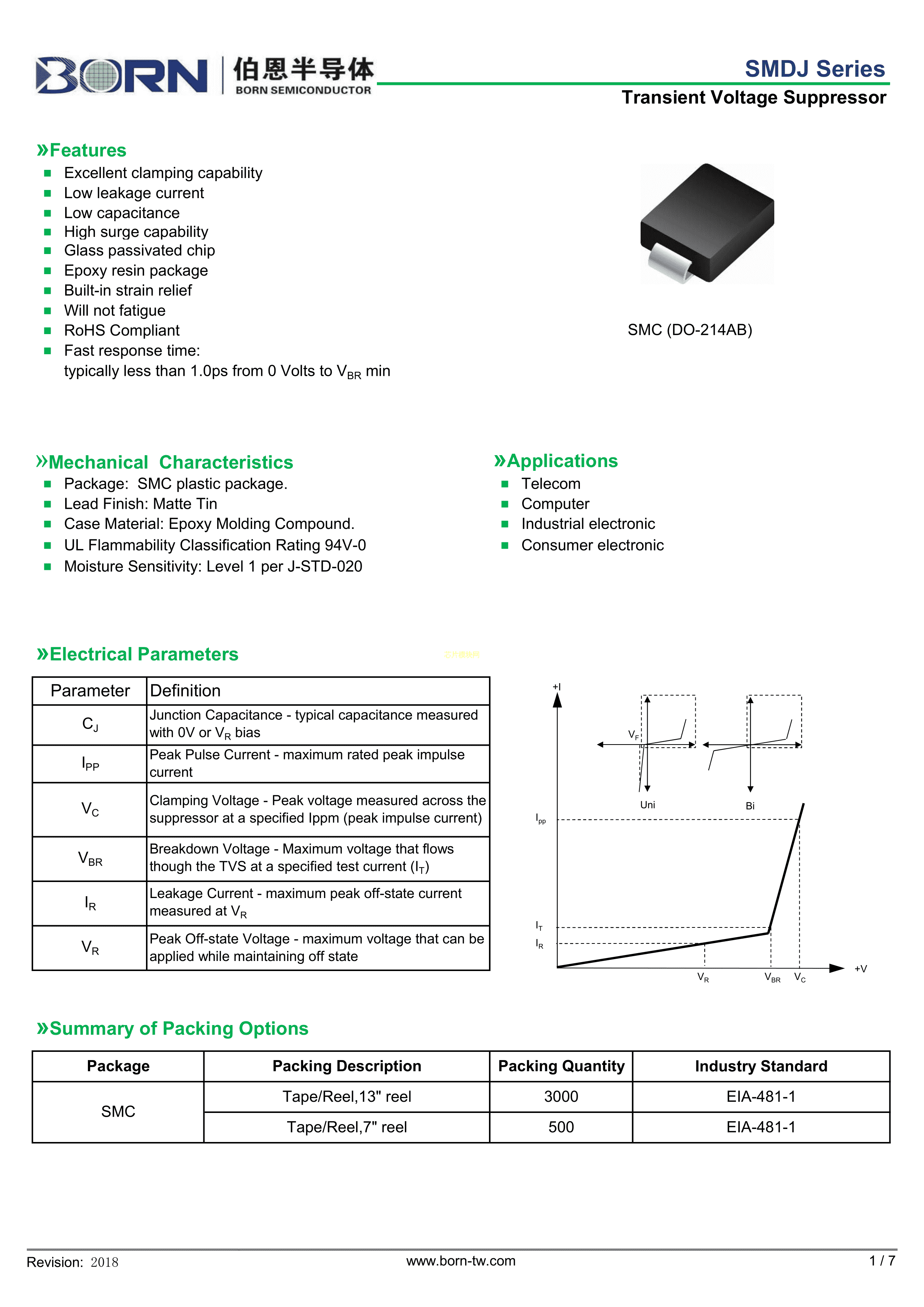 SMDJ22CA数据手册SMC封装BORN(伯恩半导体)PDF规格书,中英文下载