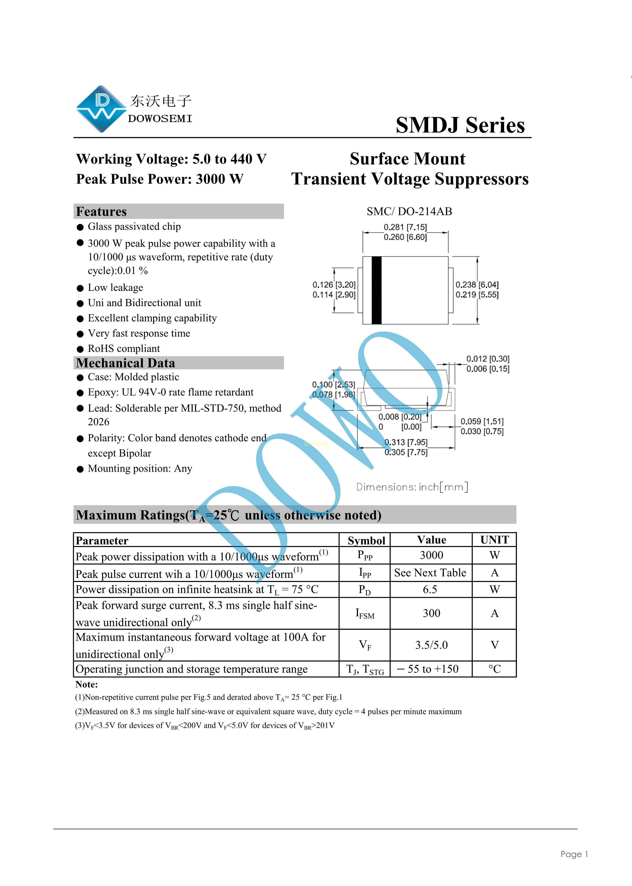 SMDJ33CA数据手册SMC(DO-214AB)封装DOWO(东沃)PDF规格书,中英文下载