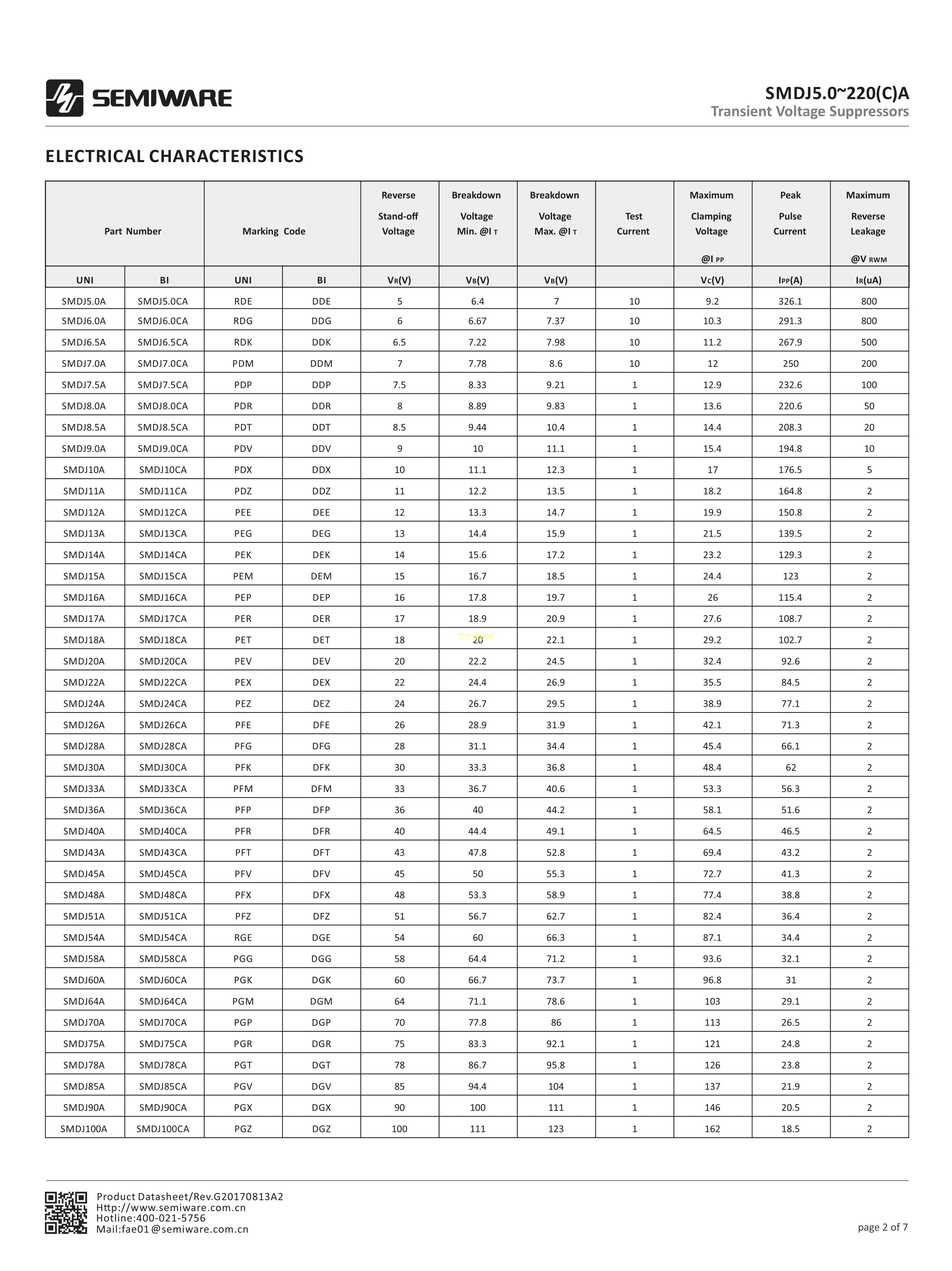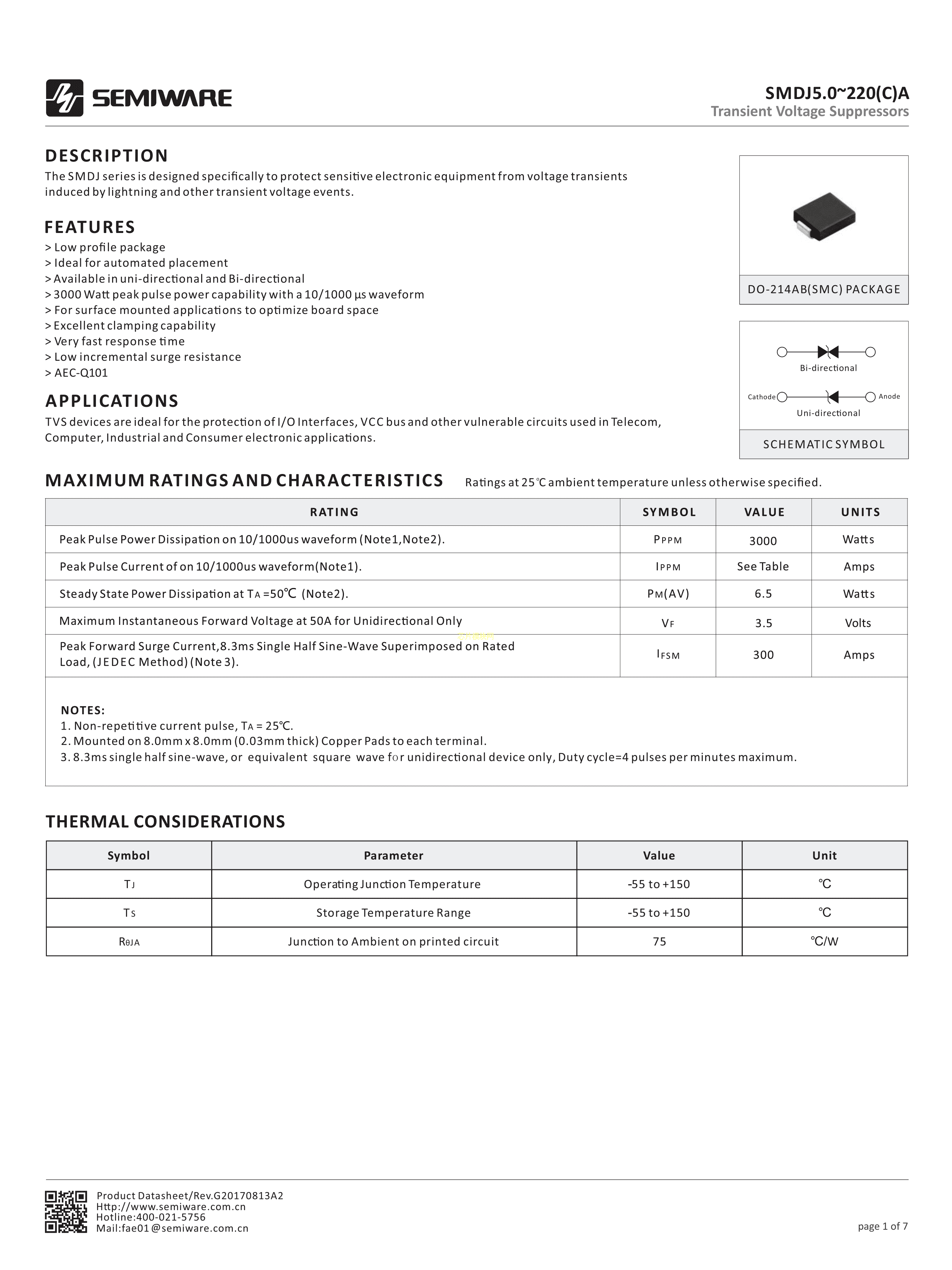 SMDJ60CA数据手册SMC-DO-214AB封装SEMIWARE(赛米微尔)PDF规格书,中英文下载