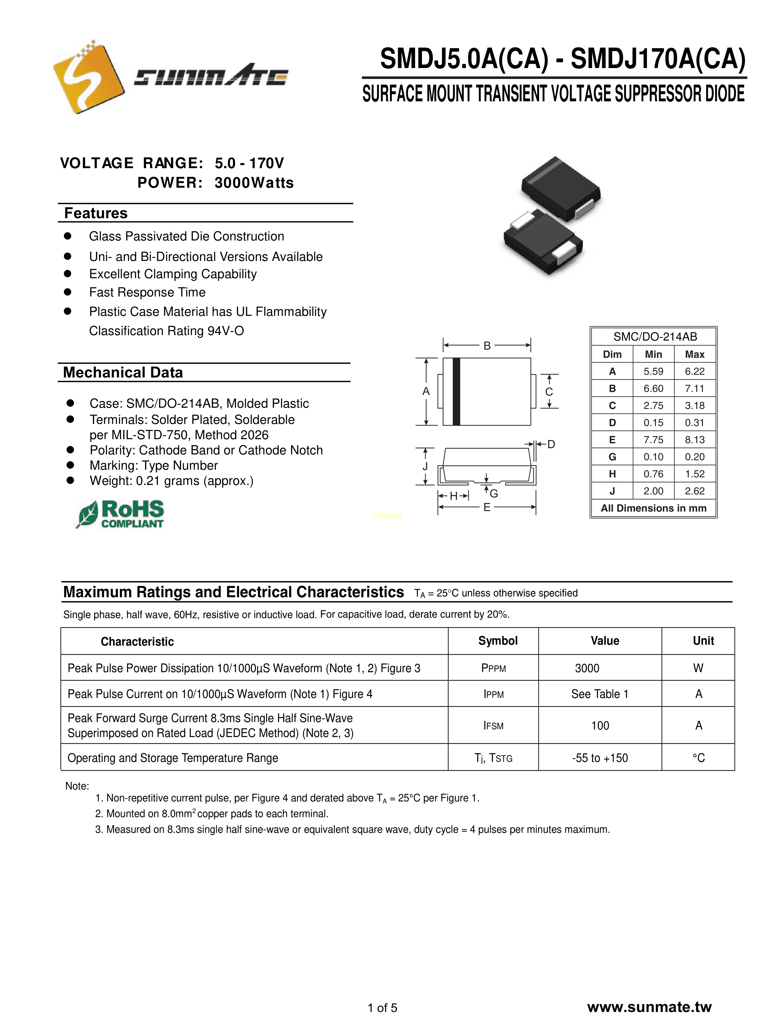 SMDJ64CA数据手册SMC封装SUNMATE(森美特)PDF规格书,中英文下载
