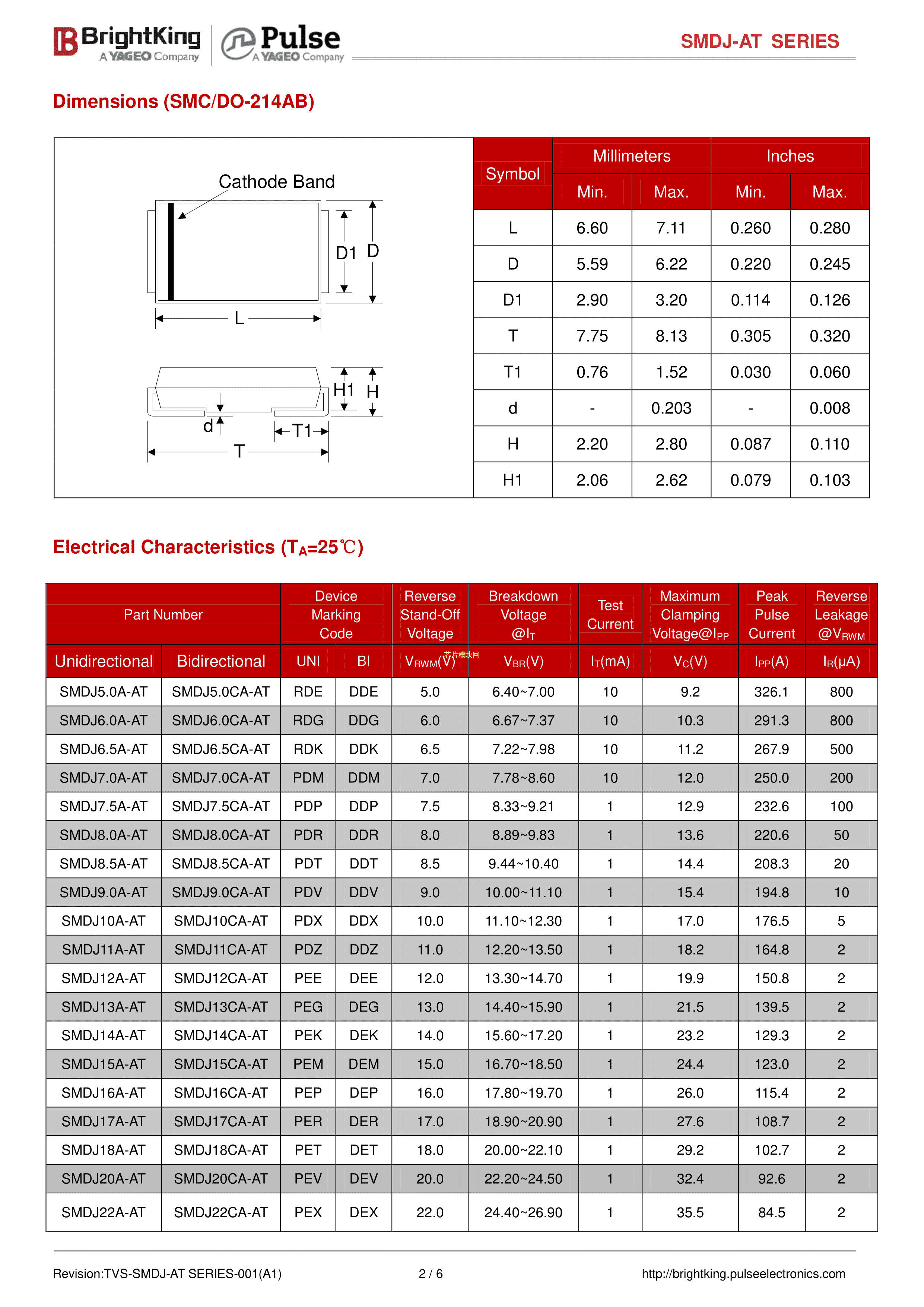 SMDJ8.5A-AT数据手册SMC(DO-214AB)封装Brightking(台湾君耀)PDF规