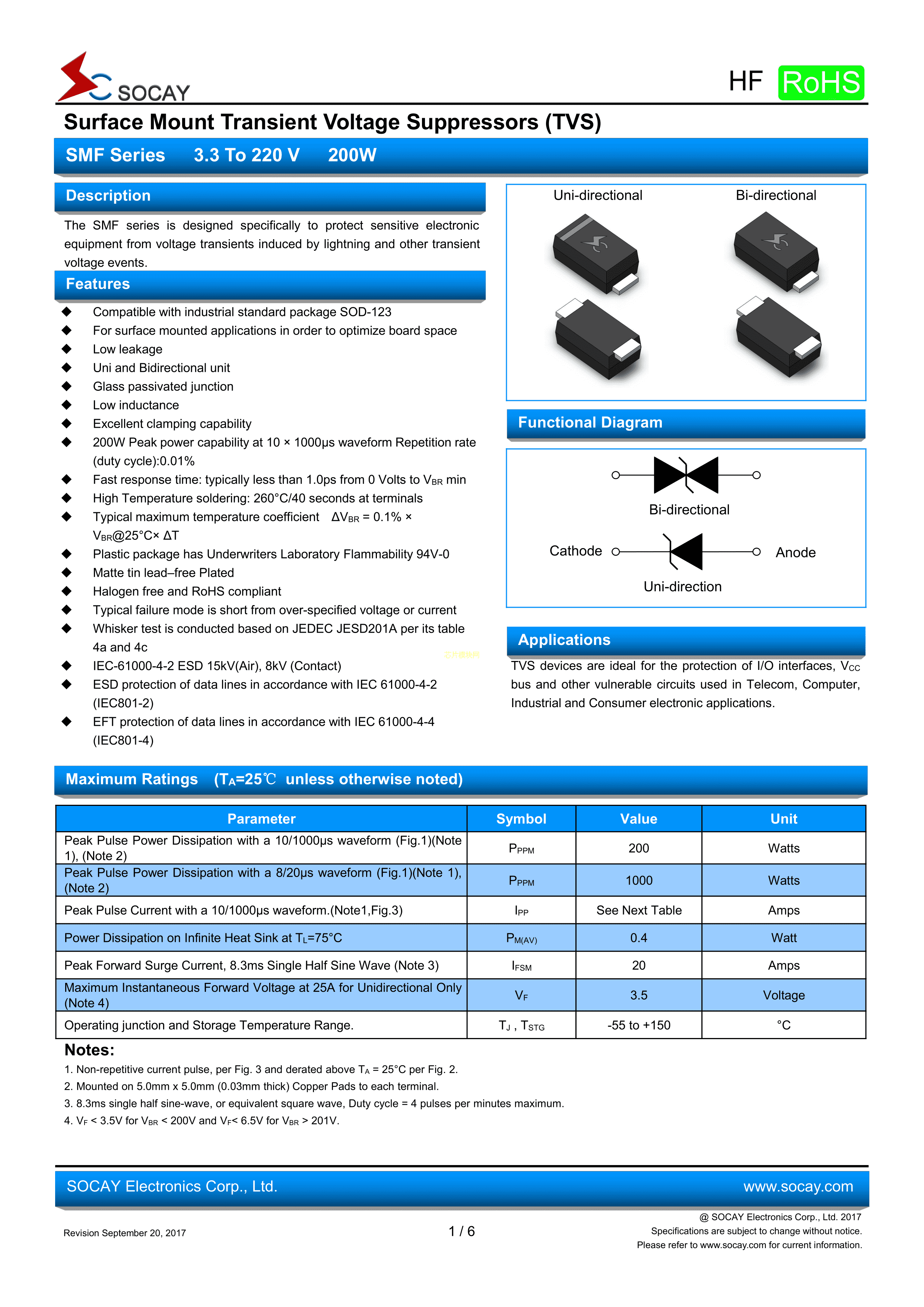 SMF100A数据手册SOD-123封装SOCAY(硕凯)PDF规格书,中英文下载