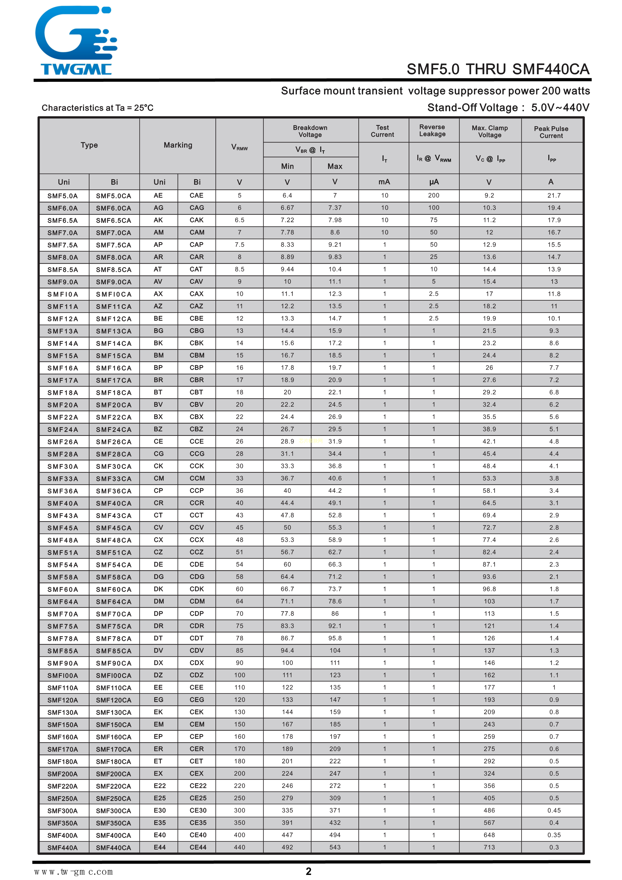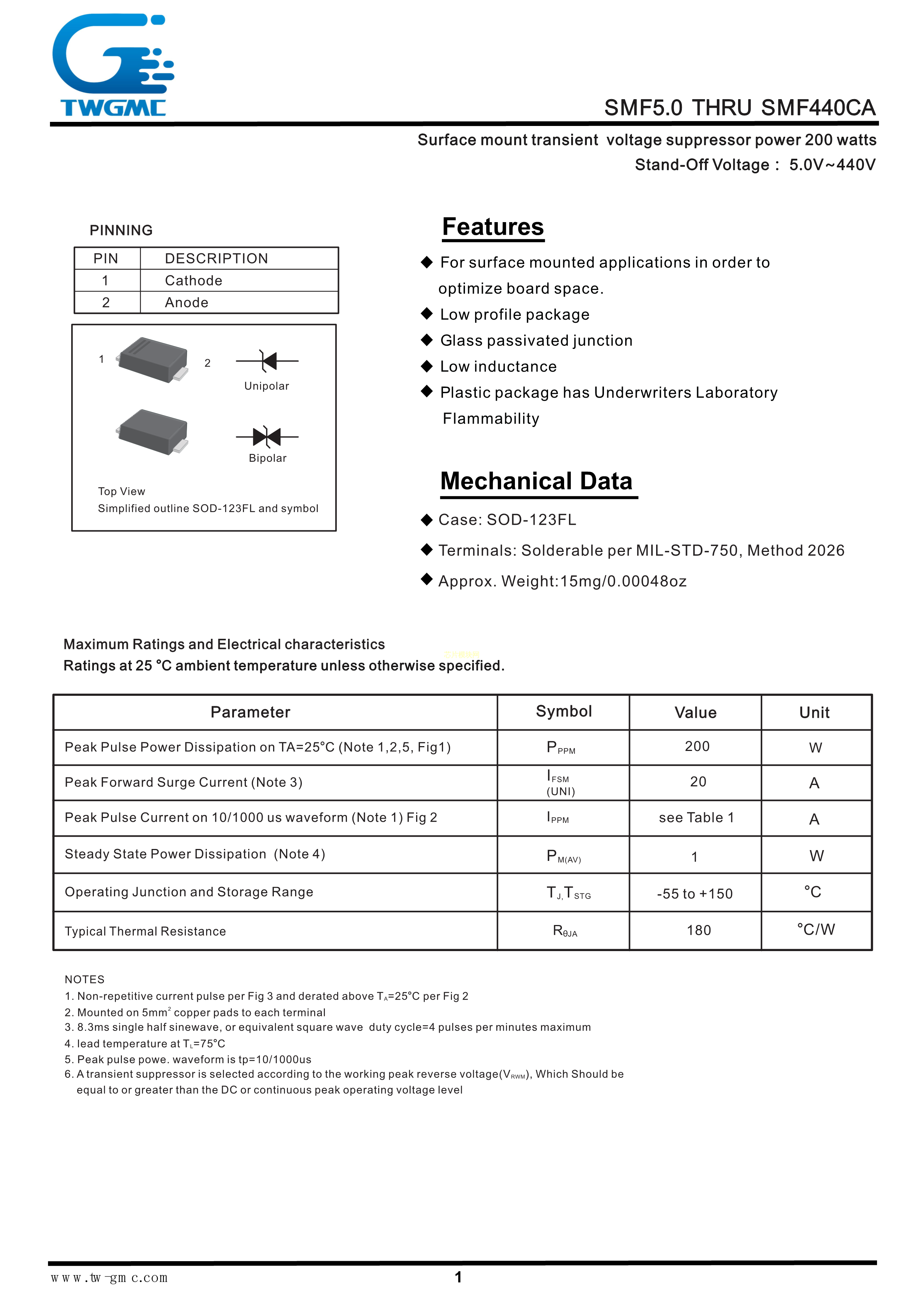 SMF10CA数据手册SOD-123FL封装TWGMC(台湾迪嘉)PDF规格书,中英文下载