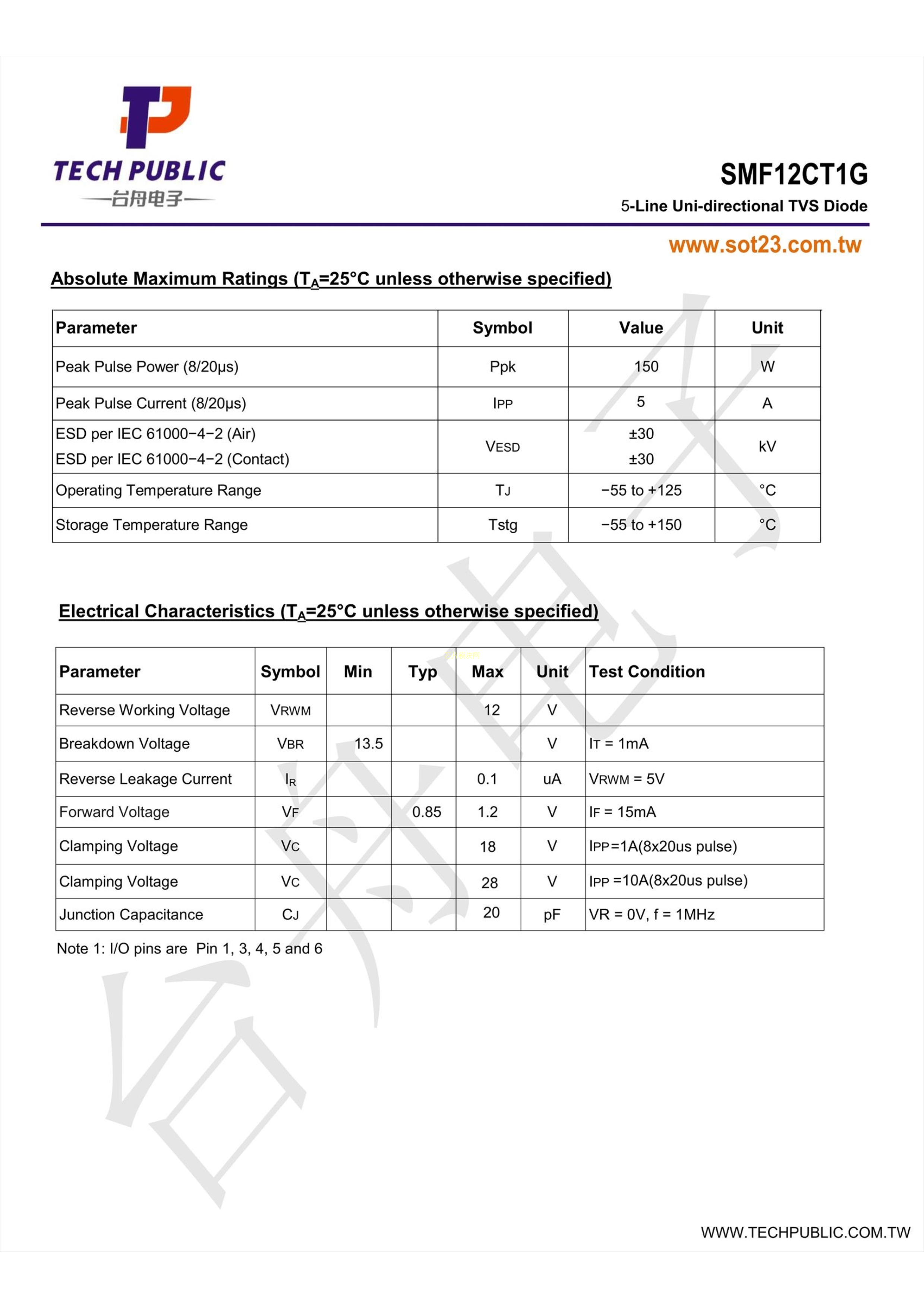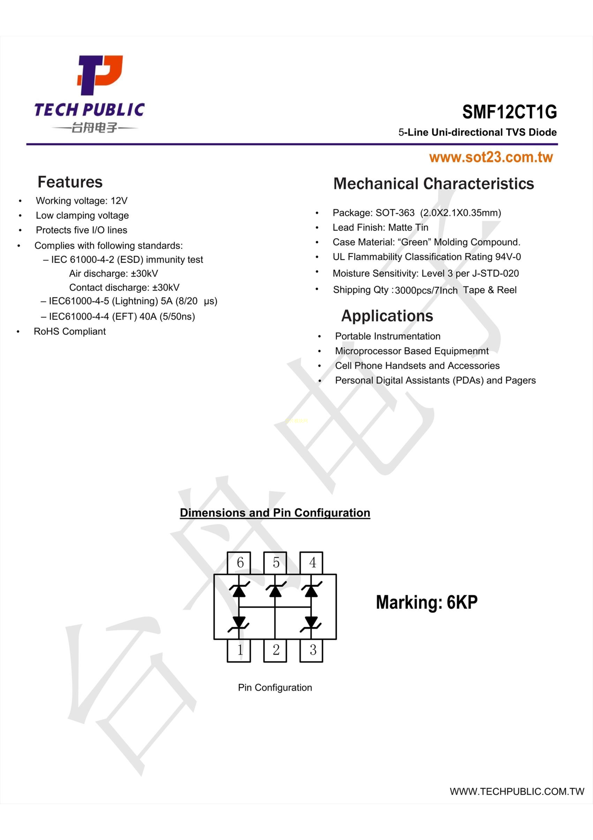 SMF12CT1G数据手册SOT363封装TECH PUBLIC(台舟)PDF规格书,中英文下载