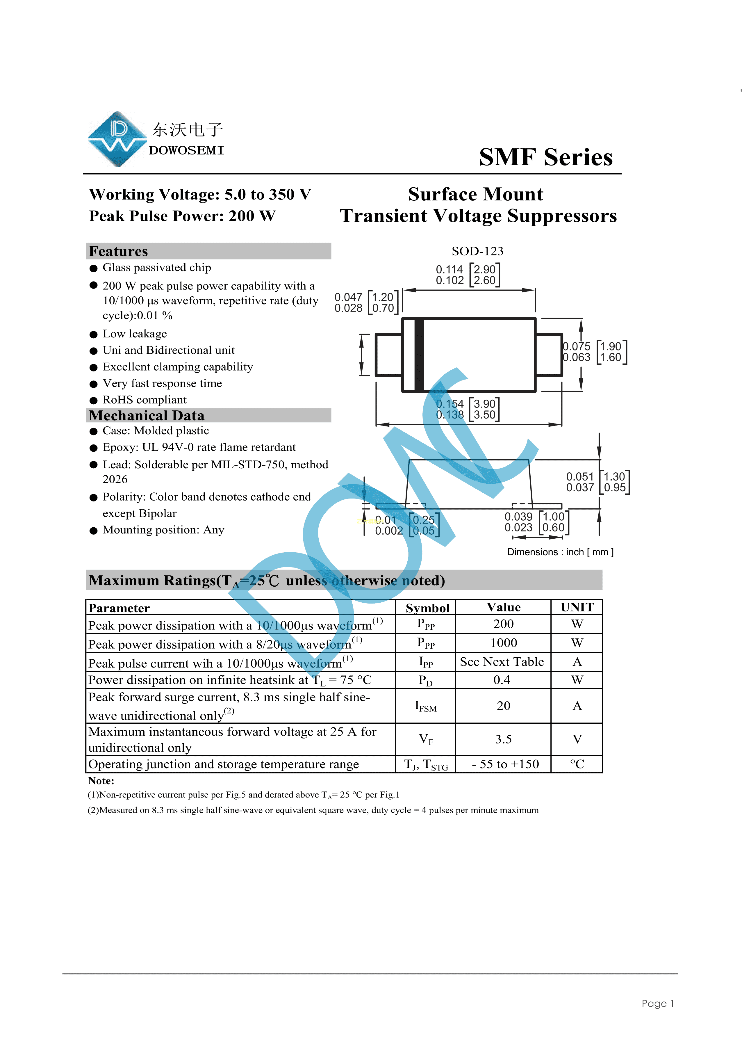 SMF13A数据手册SOD-123封装DOWO(东沃)PDF规格书,中英文下载