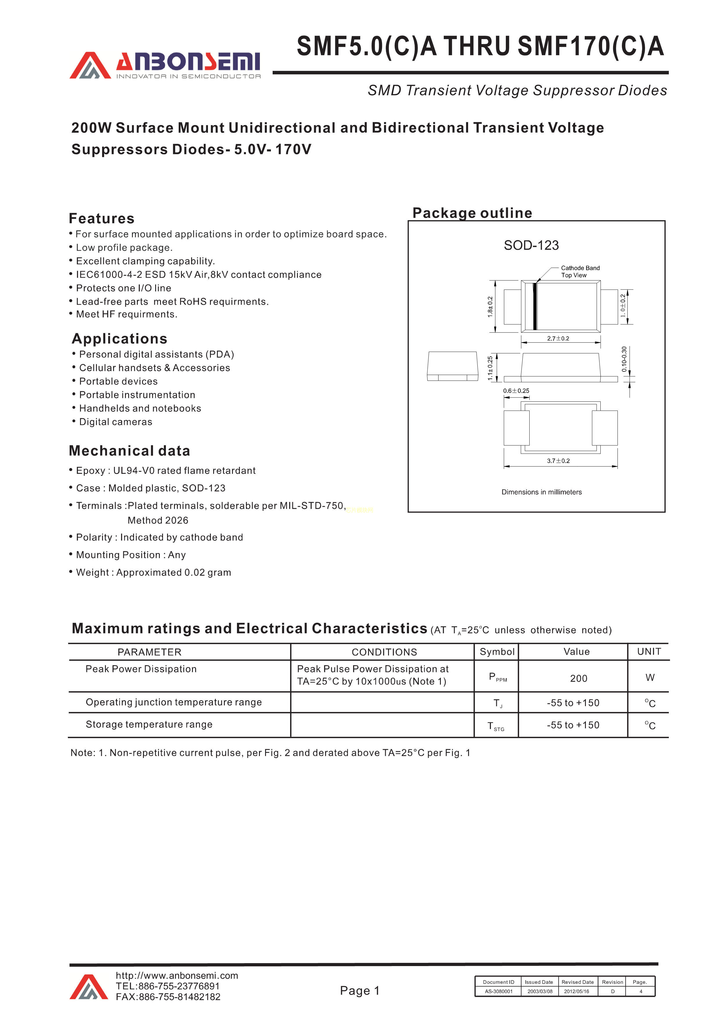 SMF17A数据手册SOD-123封装AnBon(台湾安邦)PDF规格书,中英文下载