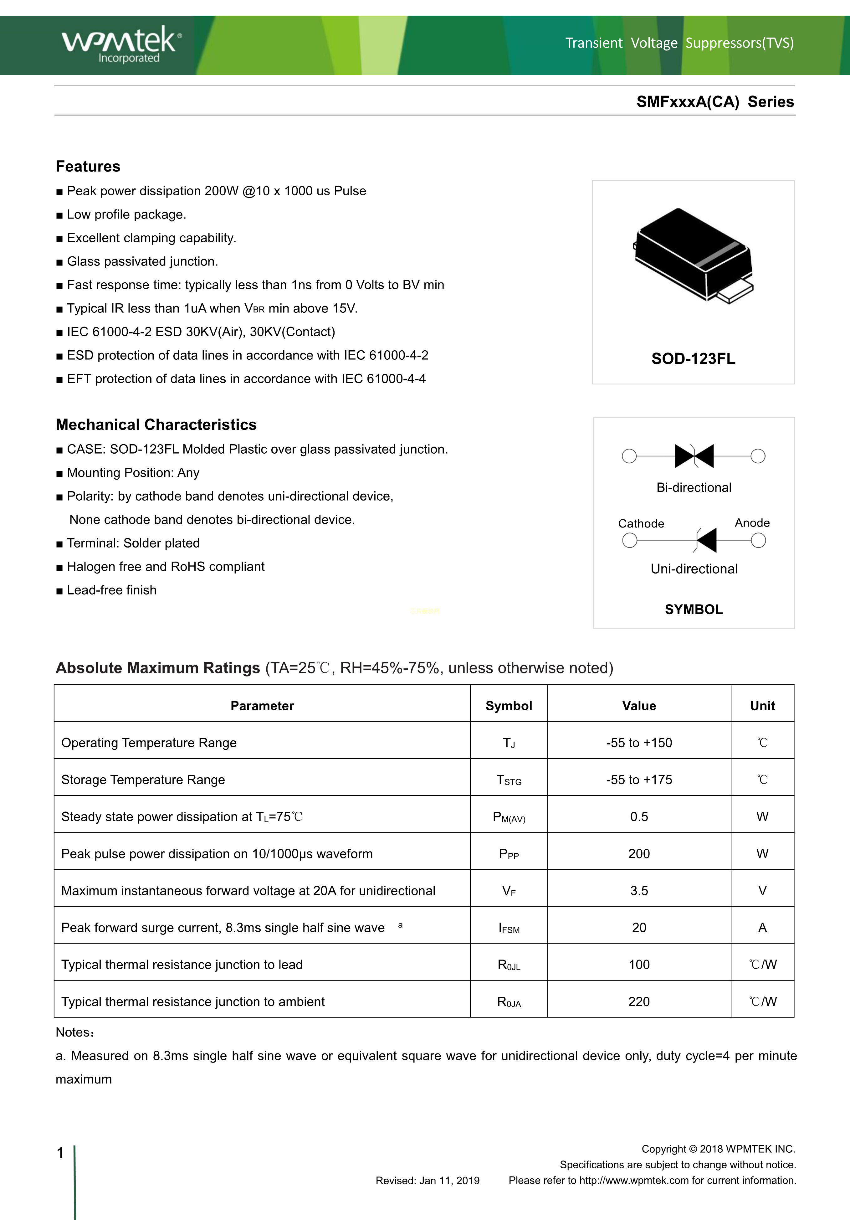SMF18A数据手册SOD-123FL封装WPMtek(维攀微)PDF规格书,中英文下载