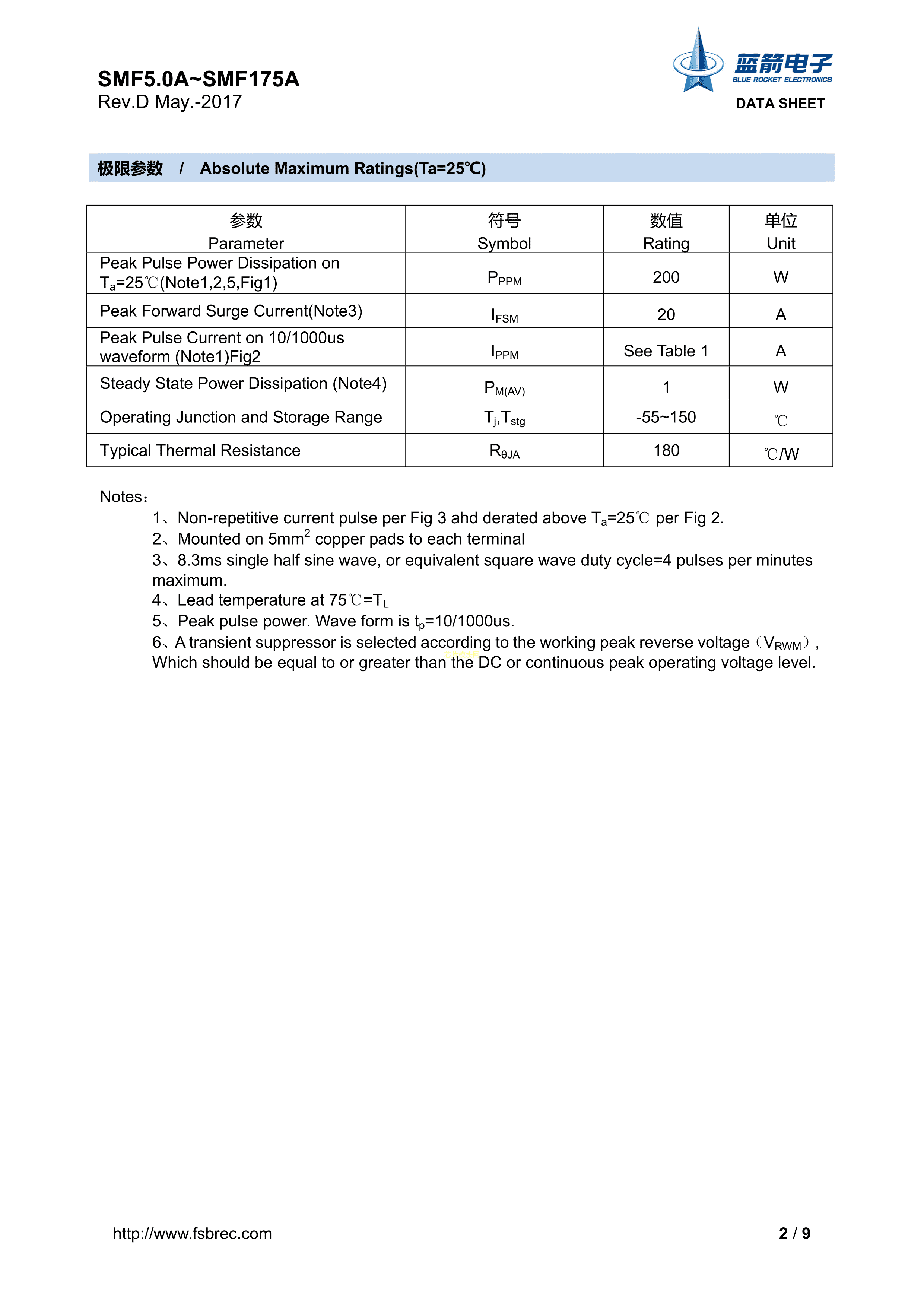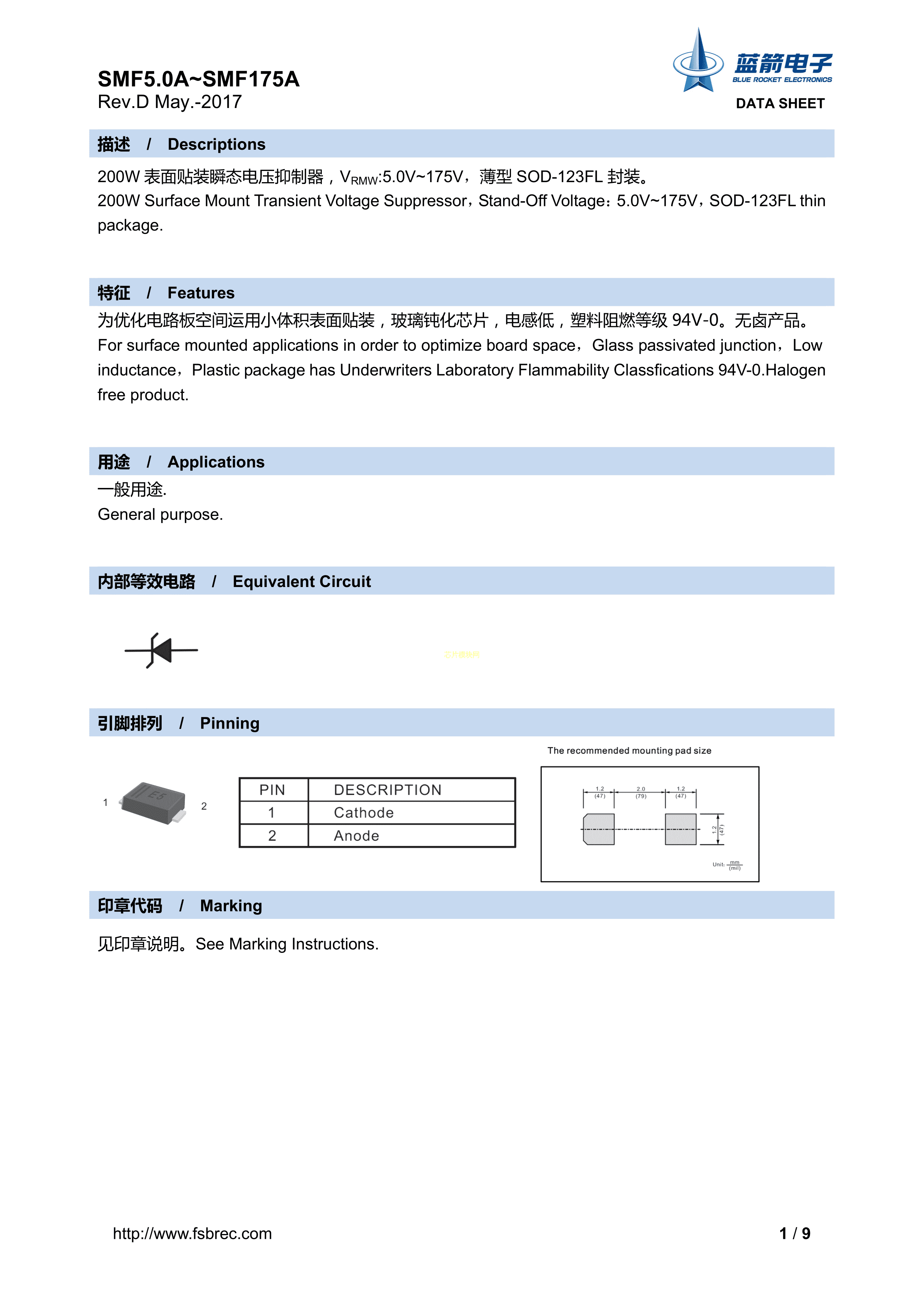 SMF20A数据手册SOD-123FL封装BLUEROCKET(蓝箭)PDF规格书,中英文下载