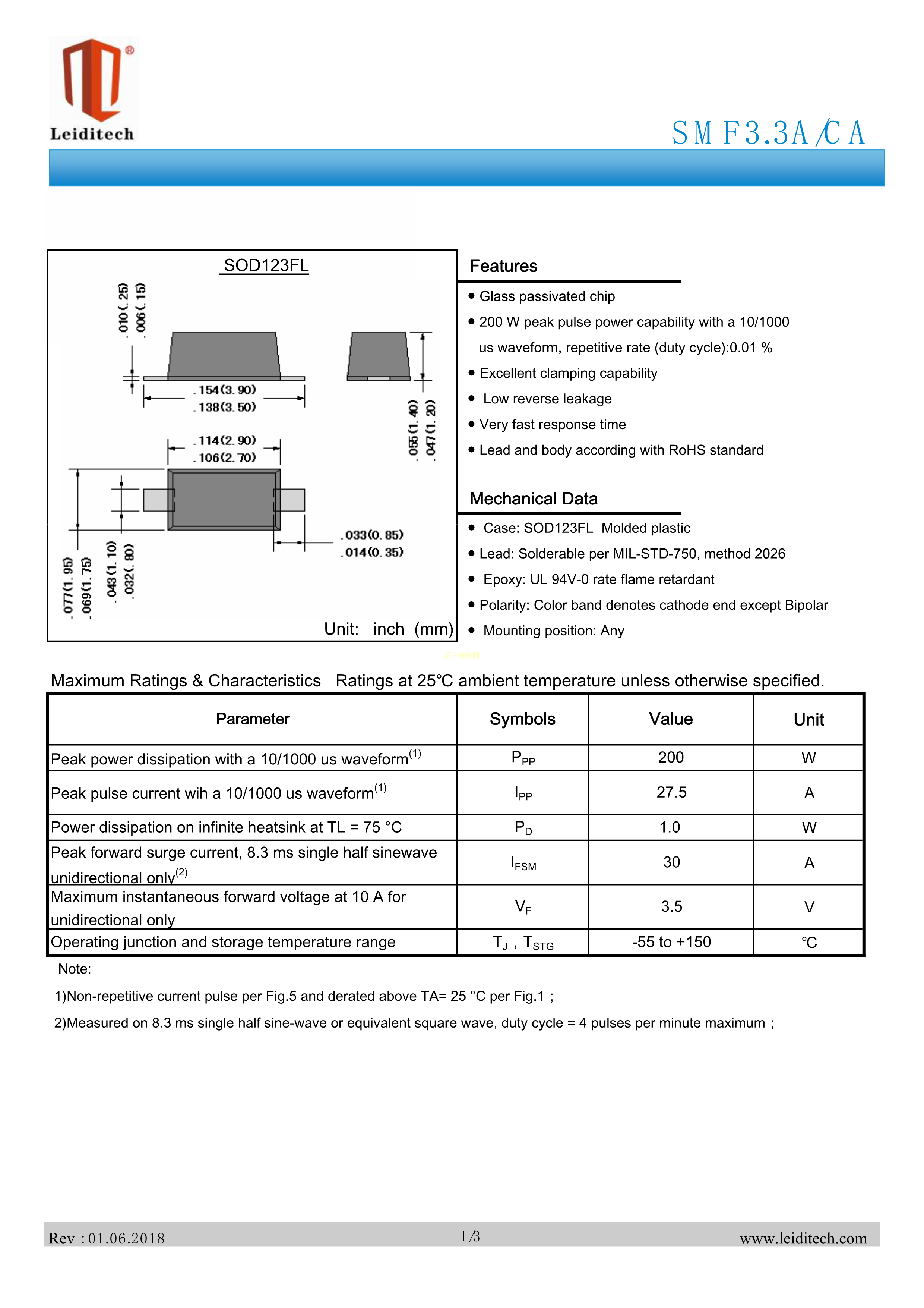 SMF3.3CA数据手册SOD-123FL封装Leiditech(雷卯电子)PDF规格书,中英文下载