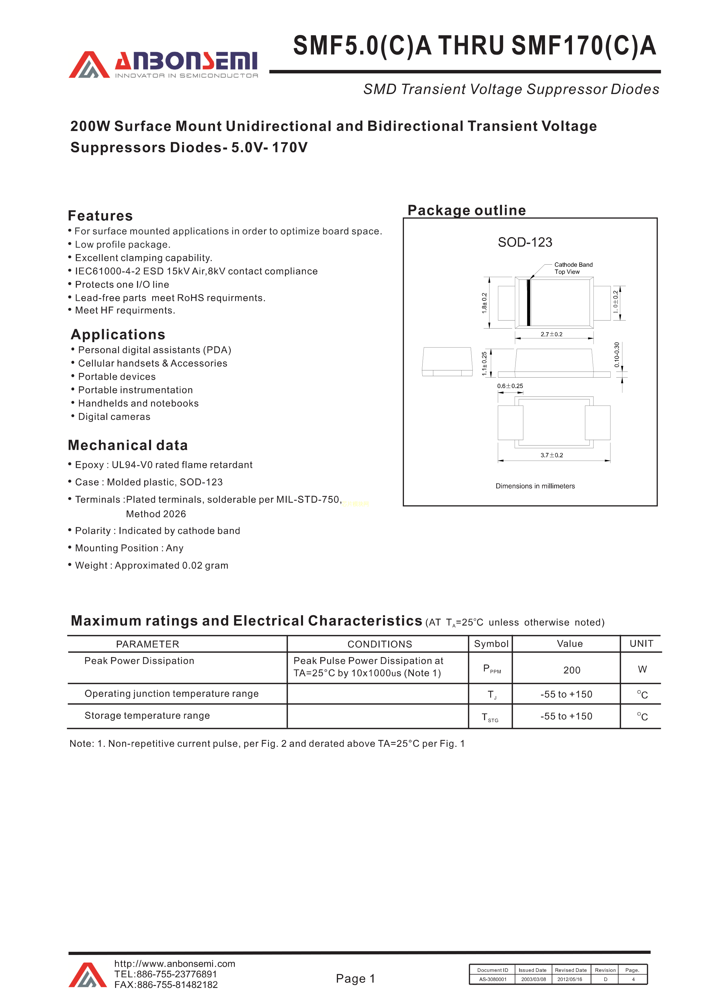 SMF45CA数据手册SOD-123封装AnBon(台湾安邦)PDF规格书,中英文下载