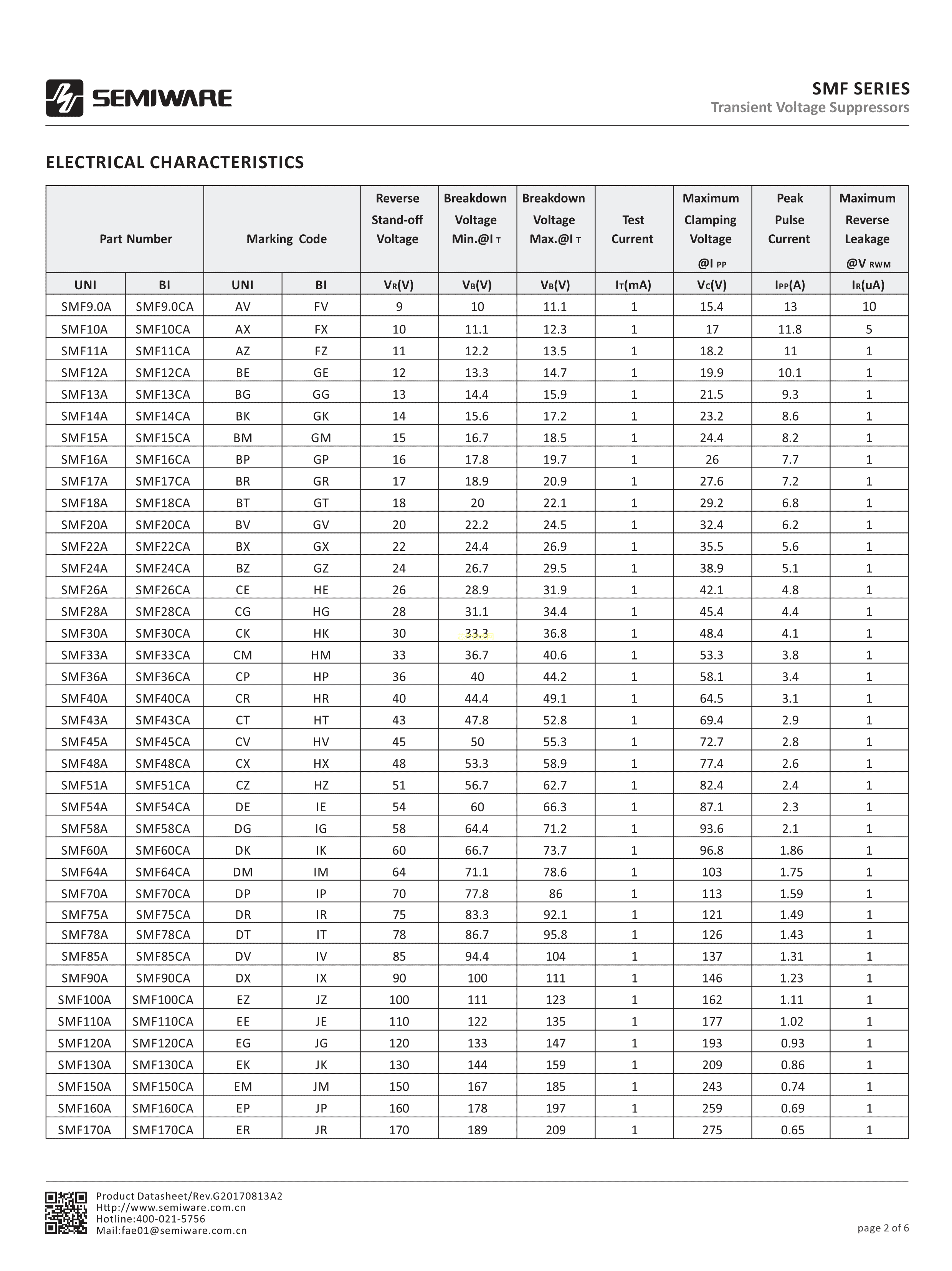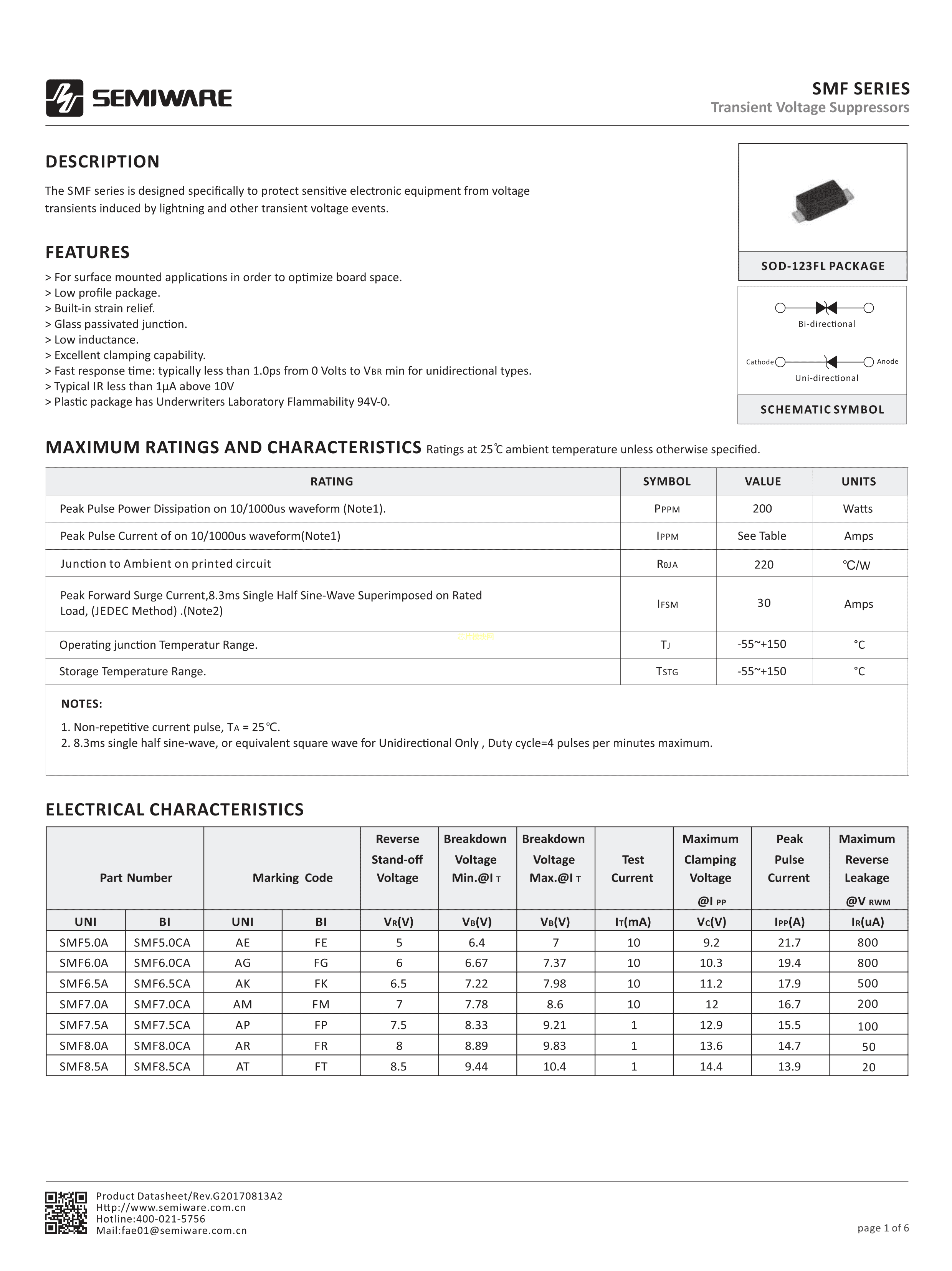SMF45CA数据手册SOD-123FL封装SEMIWARE(赛米微尔)PDF规格书,中英文下载