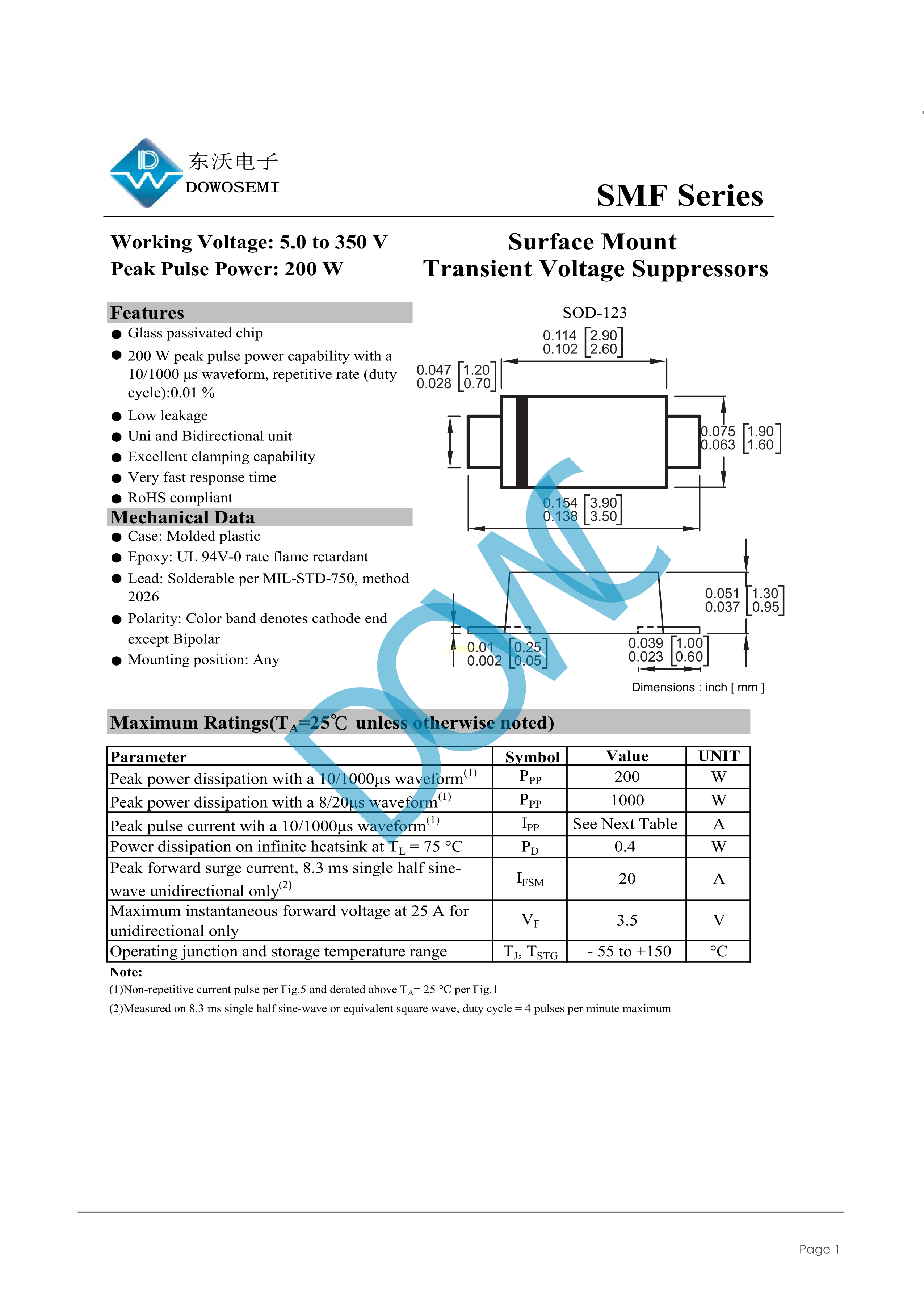 SMF6.5CA数据手册SOD-123封装DOWO(东沃)PDF规格书,中英文下载